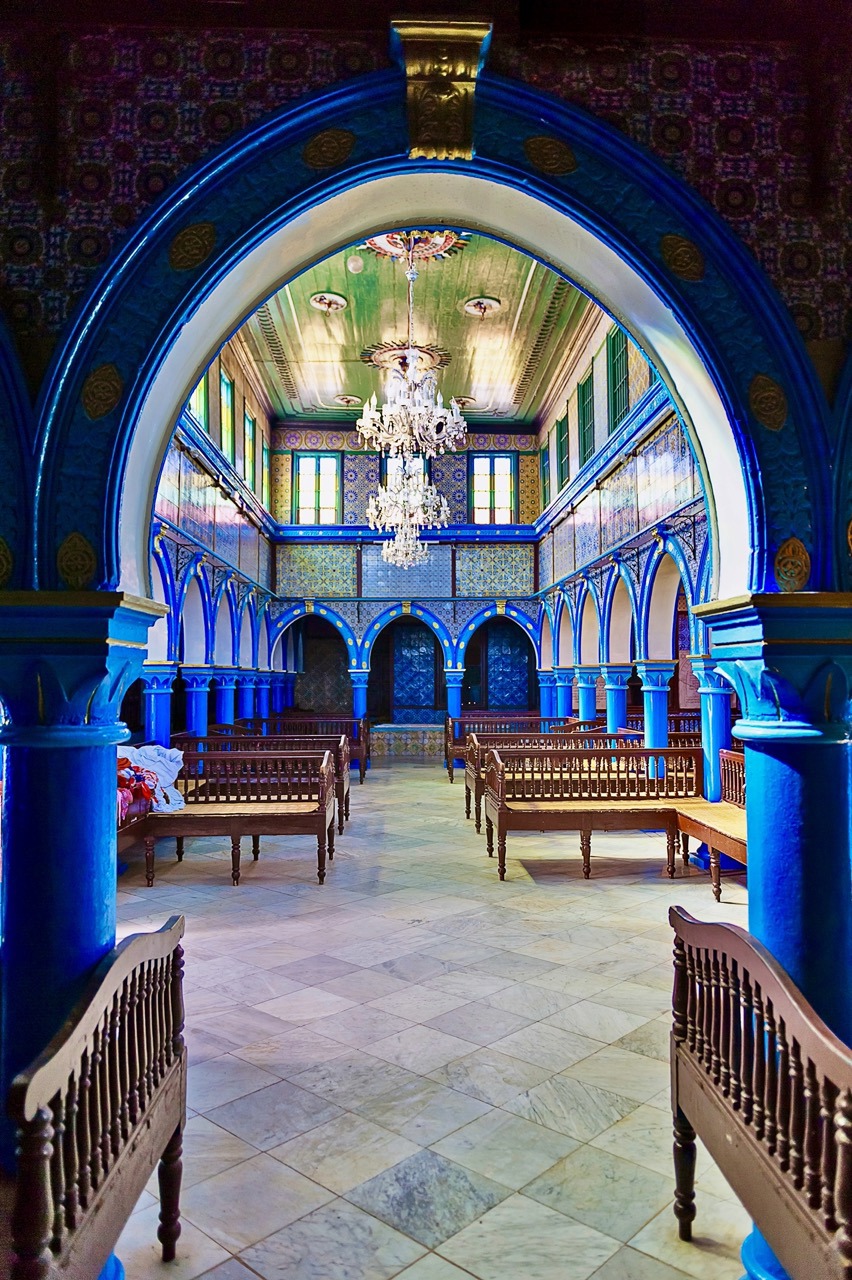 Su di un’altra isola del Mediterraneo si trova un altro incantevole luogo di culto. Parliamo della Ghriba sull’isola tunisina di Djerba o Gerba, in italiano, località resa celebre dai tour operator anni Novanta, che tuttavia tendevano a non utilizzare foto della sinagoga per le copertine dei loro cataloghi di viaggio, scegliendo più spesso immagini di bagnanti agghindate in monokini. Una scelta comprensibile, perché il tempio avrebbe rubato loro la scena. D’intenso azzurro che fa il paio con le mattonelle che rivestono interamente le pareti, la sinagoga di El Ghriba è tra le più antiche della Tunisia ed ancora oggi luogo di culto per la piccola comunità ebraica che risiede sull’isola. Potrà incuriosire sapere che alcuni nostalgici ebrei originari di quei luoghi nordafricani hanno ricostruito una piccola Ghriba a Roma, facendo copiare fedelmente da abili artigiani uzbeki le mattonelle di quell’azzurro così intenso. Per chi è cresciuto frequentando il tempio tunisino pare che ritrovarsi nella sua copia romana sia ogni volta un’emozione. Essendo quell’isola un tempo parte dell’Impero ottomano, proprio come l’Albania, non stupirà trovare che il tipico cibo del luogo, ossia il brik, somigli tantissimo al byrek albanese (che poi è lo stesso burik che potreste gustare al ghetto di Roma, per dire).