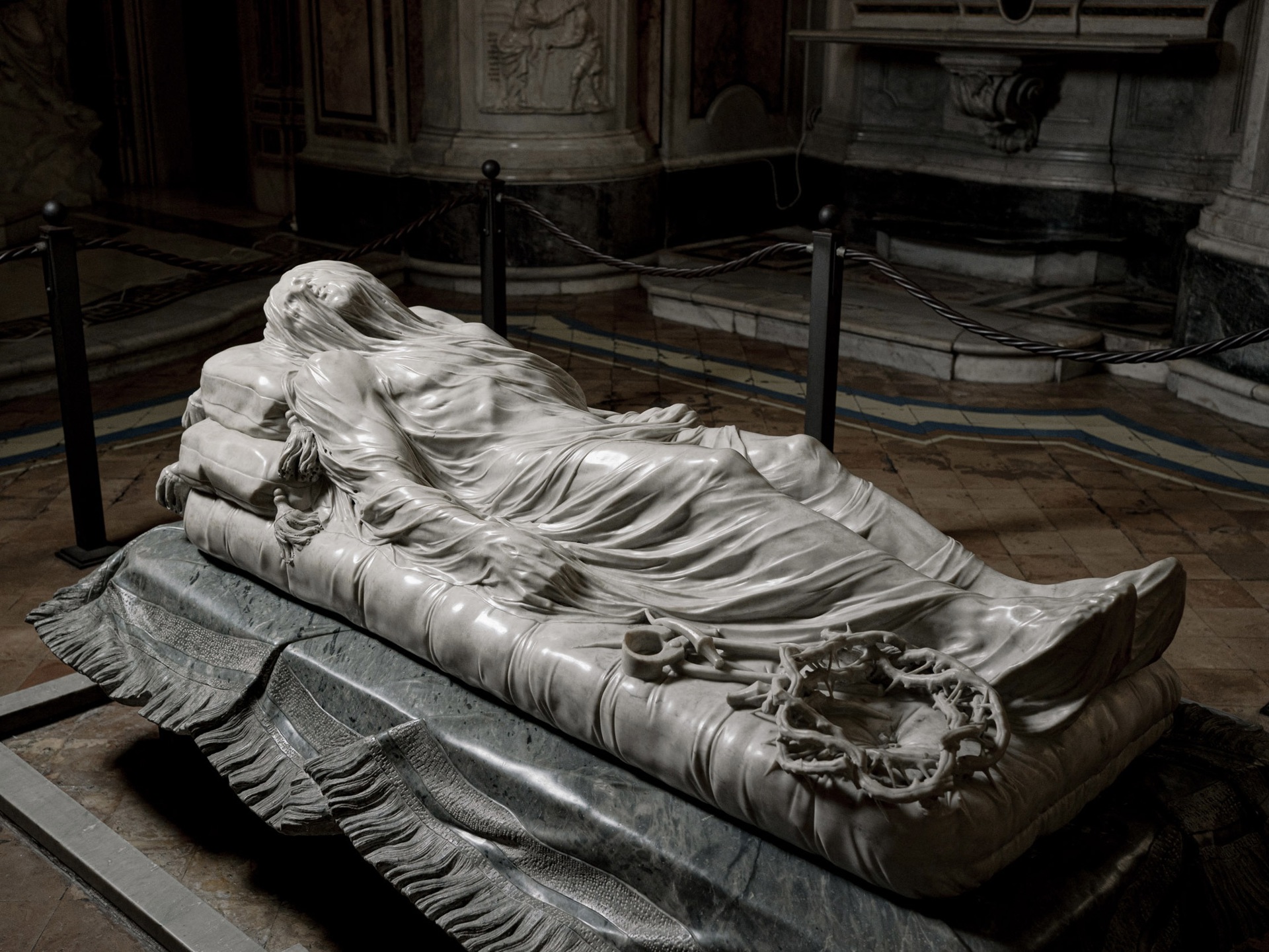 Nudo perché velato. Velato perché nudo. Il Cristo settecentesco ha surclassato le altre sculture che lo circondando nella Cappella Sansevero: dal veneto Antonio Corradini (che per il principe Raimondo di Sangro lavorò negli anni estremi) al genovese Francesco Queirolo. Lo stato maggiore degli scultori disponibili in anni in cui si inaugura la Reggia di Caserta e, nel campo della pittura decorativa il meglio lo offre, nella volta della Chiesa della Nunziatella, il più autonomo e fedele degli allievi di Solimena, Francesco De Mura.