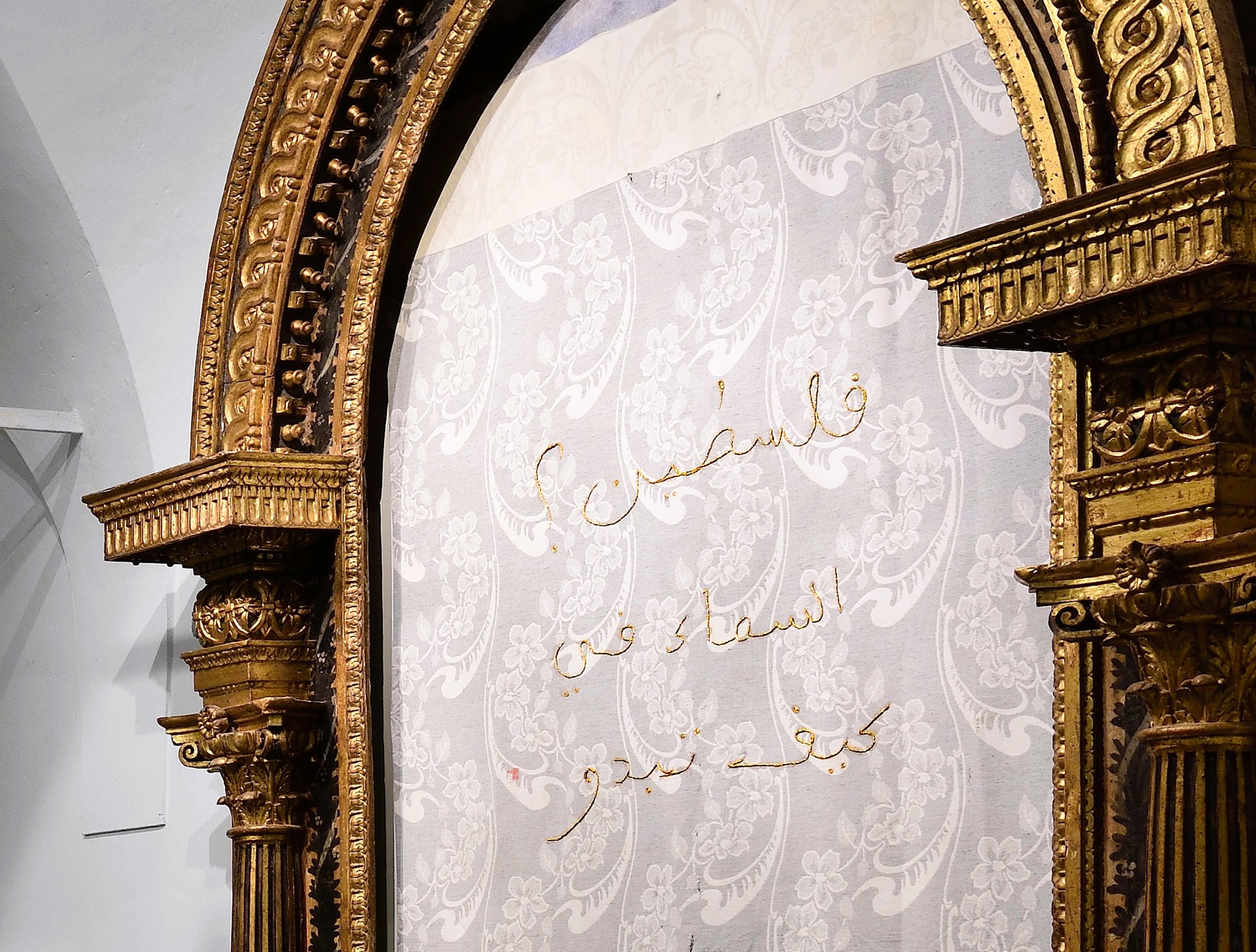 Leggi i suoi articoliCom'è il cielo in Palestina? è un progetto che iniziai a fine 2023, pochi mesi dopo il brutale attentato ai danni della popolazione israeliana. In quel momento stavo lavorando alla mostra L'oro Blu, nell'ambito di Pesaro 2024 – Capitale Italiana della Cultura. All’interno dello spazio in cui operavamo, il Museo dei Bronzi Dorati della città di Pergola, il curatore Leonardo Regano notò una cornice vuota di recente restauro e pensò di affidarmi la creazione del contenuto da associare ad essa. Risalendo alla sua storia, scoprii che la cornice era da sempre collocata nella piccola chiesa del cimitero locale. Al suo interno campeggia una tela dedicata a Santa Maria Assunta, protagonista del dipinto, affiancata da due figure chiave, una delle quali è San Paolo. Così, mi immaginai un’azione di evangelizzazione al contrario, inviando alla popolazione di Gaza una domanda, ricamata nel frattempo in arabo dalle donne della mia comunità su una coperta che mi avevano donato: Com'è il cielo in Palestina?