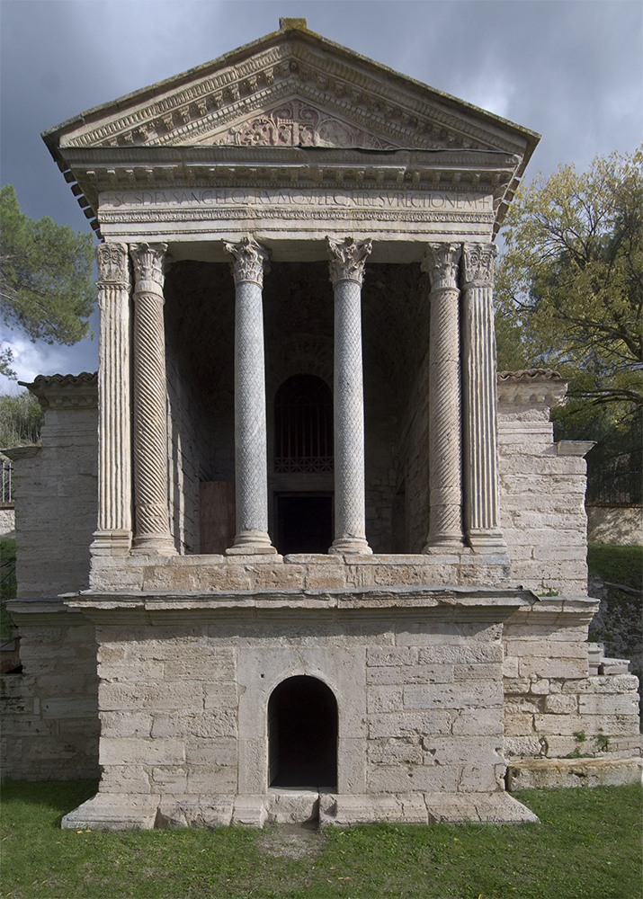 E così, questo sembra il caso del Tempietto sul Clitunno, un piccolo e raffinato monumento nel cuore dell’Umbria, non lontano da Spoleto. Il Tempietto è un piccolo oratorio con abside, preceduto da un ambiente allungato. La sua facciata è davvero elegante: quattro colonne sormontate da capitelli corinzi che sostengono un architrave, sul quale poggia un timpano. Insomma: il tutto è davvero molto austero e classico, e a uno sguardo distratto potrebbe anche essere scambiato per un tempio antico. Ma non è così, come indicano l’iscrizione cristiana incisa sull’architrave e la croce scolpita al centro del timpano; in più, il fatto che le colonne, i capitelli, e molte delle cornici siano pezzi antichi recuperati e reimpiegati, conferma la datazione «tarda» dell’edificio. Ma quanto tarda?