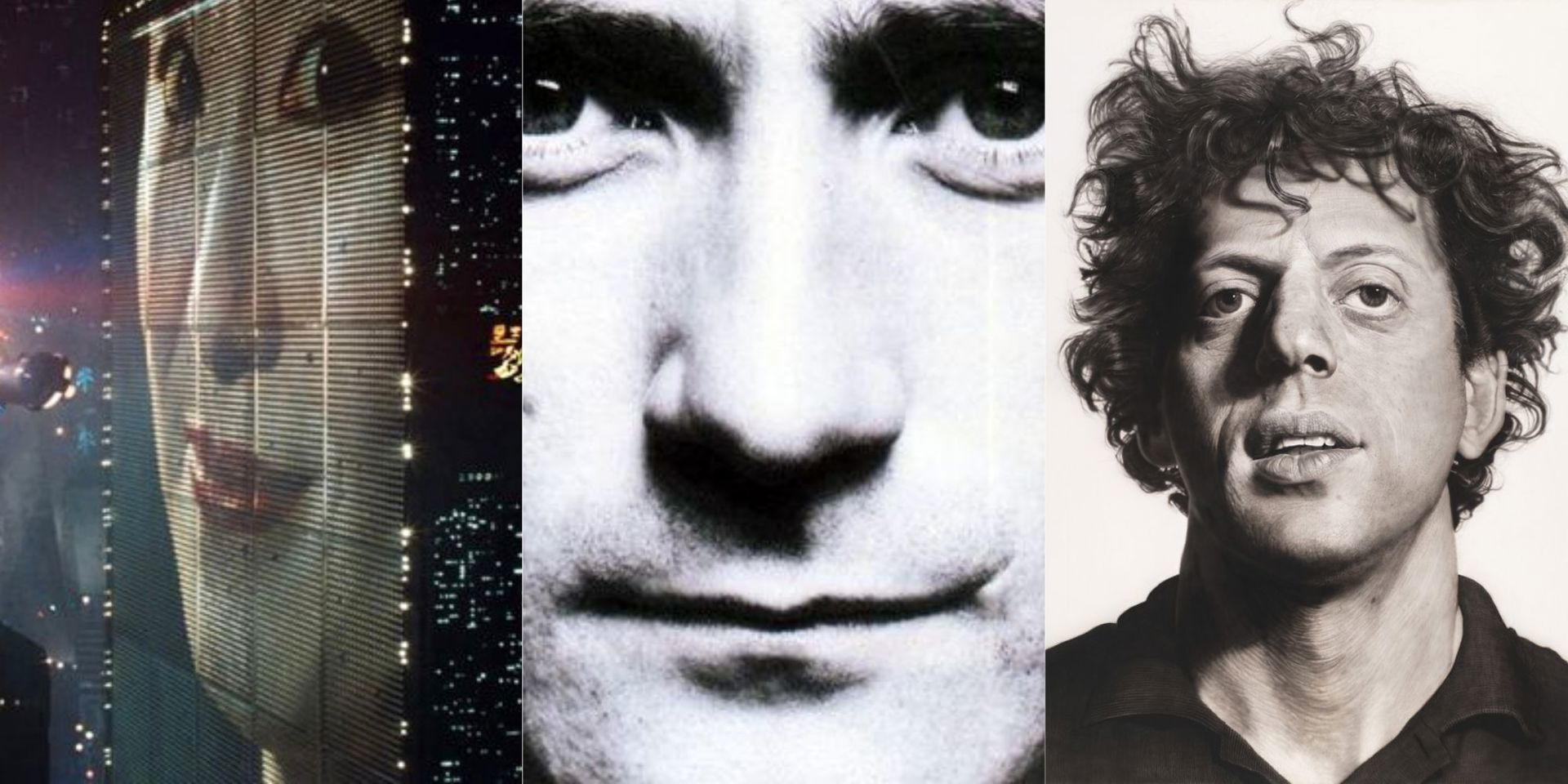 Still dal film «Blade Runner» (1982) di Ridley Scott; la copertina dell’album «Face value» (1981) di Phil Collins; «Phil» (1969), di Chuck Close (un ritratto di Philip Glass), New York, Whitney Museum of Art