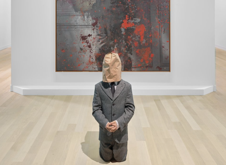«Negli Stati Uniti, chi beve birra in pubblico deve coprire la bottiglia con un sacchetto. Ma tutti sanno cosa c’è dentro. Così ho pensato: perché non nascondere anche il volto di Hitler con un sacchetto?» dichiarava l’artista nel 2022 in un’intervista a Francesco Bonami. È la filosofia dell’occultamento come provocazione. Il sacchetto non nasconde: suggerisce. Non protegge: amplifica. Non censura: sottolinea. La figura inginocchiata resta, come in «Him». La resa materica – cera, resina poliestere e capelli umani – è la stessa. La postura è simile, ma ora lo sguardo dello spettatore si infrange su un muro opaco. Non si può più identificare il soggetto, e proprio per questo si è costretti a porsi domande ancora più complesse. Chi è? Che cosa rappresenta? E perché ci sentiamo comunque turbati? In questo senso «No» si libera del “grande nemico” per riflettere sull’atto stesso di guardare, di interpretare, di riconoscere il male. Se in «Him» lo shock era determinato dall'identificazione – quell’istante in cui si realizza che dietro l’apparente innocenza c’è Hitler – qui è l’ambiguità a generare spaesamento. Non sapere chi c’è dietro il sacchetto diventa più inquietante che riconoscere l’identità. Il male si fa invisibile, e per questo ancora più insinuante.