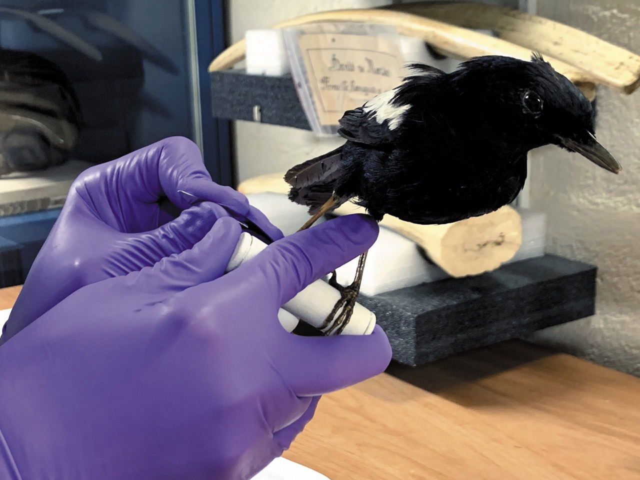 Prelievo di un campione dalla zampa di un uccello, al Mnhn, Musée national d’Histoire naturelle, Parigi. Photo © Adrian Van Allen