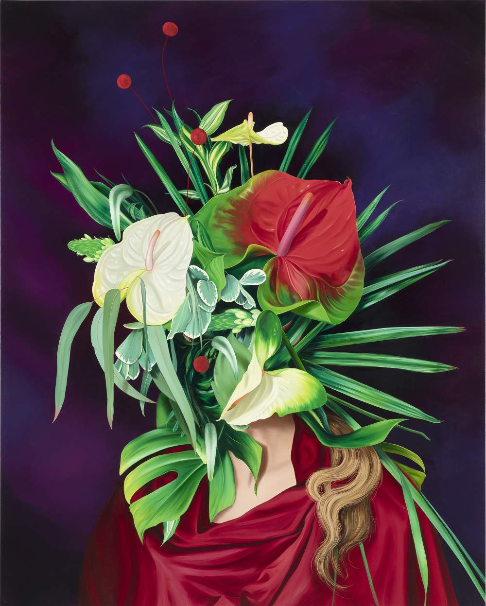 Juszkiewicz li distorce e li nasconde dietro a grandi mazzi di fiori, piante e insetti, maschere tribali o tessuti drappeggiati. I dipinti di Juszkiewicz suscitano un effetto perturbante e un sentimento di incertezza che rimanda alla libertà creativa di Arcimboldo. I suoi sono travestimenti in piena regola secondo una tradizione ben nota all’arte del ’900 che va da Alberto Savinio a Luigi Ontani fino a Yasumasa Morimura e Gillian Wearing.