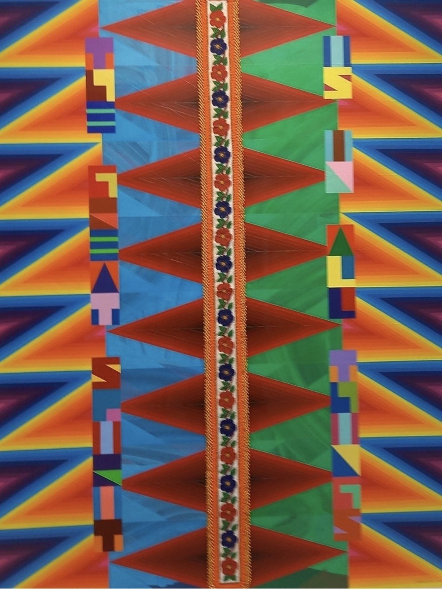 In quanto alla superficie pittorica, realizzata con colori acrilici stesi su carta da acquarello ritagliata, quel gioco di astrazioni geometriche e combinazioni cromatiche si ispira alle estetiche tribali. Un esempio sono i decori dei «parfleche», contenitori in pelle conciata la cui realizzazione presso i nativi era prerogativa delle donne, che non disegnavano i loro motivi sulle pelli, ma li dipingevano direttamente seguendo uno schema visualizzato solo mentalmente. Nelle due opere vediamo anche utilizzato il particolare alfabeto messo a punto da Gibson. Le parole scelte dall’artista, che divengono i titoli stessi delle opere, introducono concetti legati alla spiritualità dei nativi. Come la frase «Il grande spirito è in tutte le cose,» che riassume la voce proveniente dal passato di un giovane capo Cayuse.