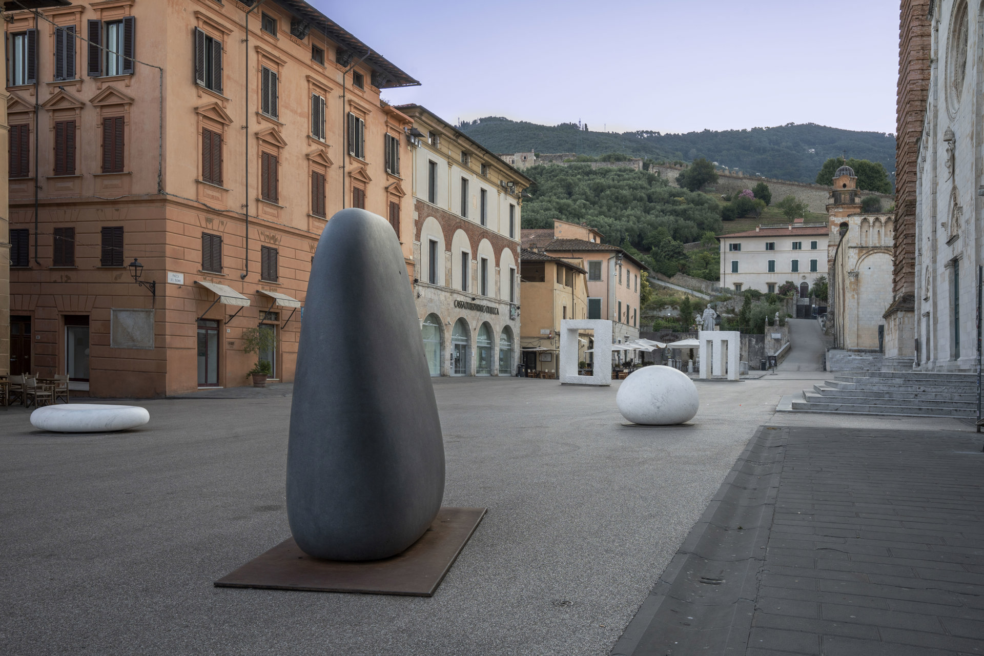 Leggi i suoi articoliUna grande panchina verde, situata lungo i resti dell’antica rocca, offre una delle vedute più suggestive di Pietrasanta: da lì lo sguardo si estende fino al mare della Versilia, mentre la piazza principale, con il Duomo di San Martino, emerge incastonata tra strade e palazzi storici. In questo contesto urbano si inseriscono le sculture di Kan Yasuda (1945), forme talvolta tondeggianti, talvolta totemiche, che richiamano detriti di un tempo remoto e allo stesso tempo dialogano con armonia con l’ambiente circostante.