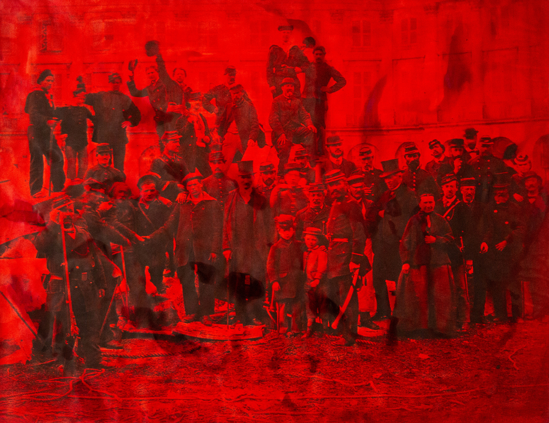 La sua pratica artistica spesso consiste nel dipingere con la china su fotografie d’archivio: per la Comune usa il rosso.