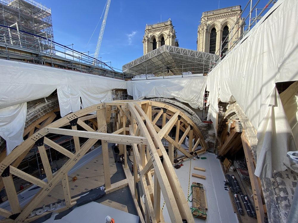 Intanto a Parigi più di 500 persone lavorano al restauro di Notre-Dame. Lo «zoccolo» di legno di 80 tonnellate su cui si deve poggiare la nuova guglia, ricostruita identica a quella di Viollet-le-Duc, è stato assemblato. La guglia, ancora circondata da impalcature, svetterà a 66 metri entro la fine 2023. Enormi impalcature continuano ad occupare l’interno della chiesa, benché la ricostruzione delle volte della navata e di una parte del coro sia completata. Stanno tornando al loro posto le vetrate restaurate in laboratorio e l’organo settecentesco, le cui 8mila canne sono state rimontate a una a una. Ma la strada è ancora lunga, soprattutto perché va ricostruita la «foresta» di legno di quercia (le capriate del sottotetto) che dovrà essere ricoperta da tavole di piombo. Il Psbc prevede un dispositivo antincendio a nebulizzazione d’acqua che sarà realizzato su misura. La torre campanaria deve essere resturata e gli archi rampanti devono essere liberati dai rinforzi di legno installati dopo il rogo. L’architetto Philippe Villeneuve ha ipotizzato la creazione di un Musée de l’œuvre Notre-Dame, come a Strasburgo e Reims. Da parte sua il presidente Macron ha confermato la riapertura nel 2024, l’8 dicembre.
