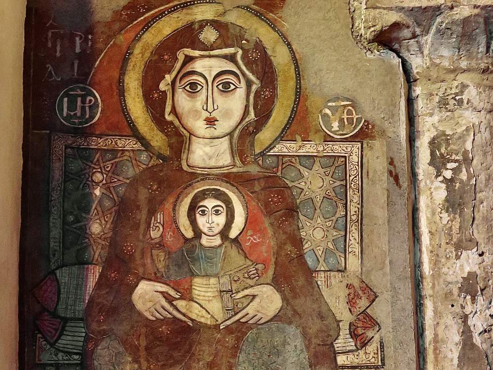 Inclusa una Madonna, che tiene il Bambino sulle gambe e che con la destra aperta benedice alla maniera ortodossa, ossia piegando l’anulare col pollice, così da mostrare tre dita soltanto. L’affresco sarà stato anche ridipinto più volte, come nella tradizione copta (anche se questo esce da un restauro recente) ma, avendo freschi nella memoria i cosiddetti «ritratti del Fayyum» esposti al Museo Egizio del Cairo, non si fatica a individuare la fonte d’ispirazione che ha guidato l’ignoto pittore d’epoca bizantina (diciamo così). Inoltre, lo scranno sul quale siede la Vergine mostra decori geometrici che sembrano cavati da un coffee-table intarsiato in avorio e madreperla, come quelli che si vedono in vendita al Khan el-Khalili, il bazar del Cairo (e che, al vostro ritorno, vi pentirete di aver lasciato lì).