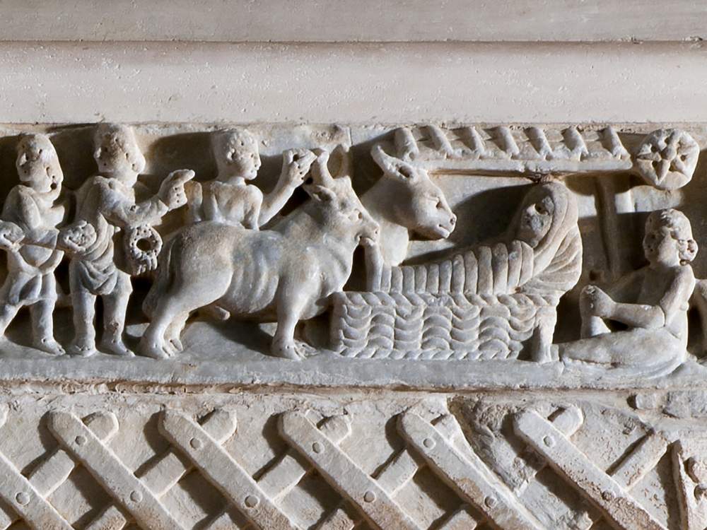 Il cancello era sostenuto da due pilastrini scanalati, di cui è rimasto solo il destro. Il motivo del cancello è piuttosto raro nei sarcofagi, ma dal punto di vista iconografico si può ricondurre a quello, molto più frequente nella scultura funeraria antica, della porta, a volte socchiusa, che vuole rappresentare il transito dalla condizione caduca di questo mondo a una sconosciuta dimensione ultraterrena, che in chiave cristiana si traduce in una speranza di vita eterna, di resurrezione. In più, la simulazione del cancello può suggerire il locus amoenus, quel giardino che per definizione era cinto e chiuso da grate e cancelli, giardino che nell’ottica cristiana è il paradiso, regno dei Beati.