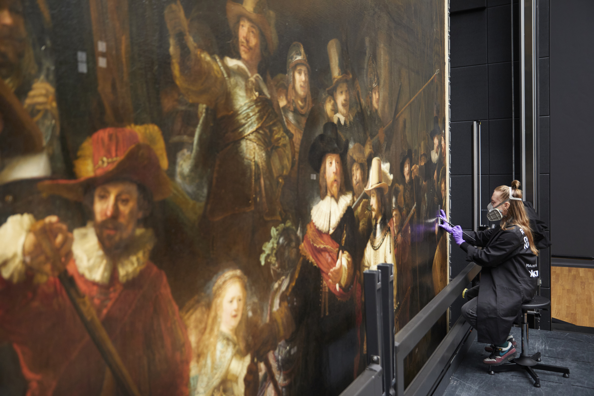 Come nella migliore tradizione museale nordica, da sempre aperta e inclusiva nei confronti del pubblico anche non specialistico, tutte le fasi si svolgono in un’apposita, monumentale, teca di vetro allestita dall’architetto francese Jean-Michel Wilmotte su una parete della Galleria d’Onore, che come un palcoscenico spettacolarizza le molte cure dedicate all’opera. A occuparsene è lo staff tecnico del Rijksmusum, coadiuvato da esperti provenienti da musei e università locali e internazionali, utilizzando un sistema di piattaforme elevatrici che consentono di raggiungere l’intera superficie pittorica di un’opera che attualmente misura circa 4 metri di altezza per oltre 4,50 di larghezza.