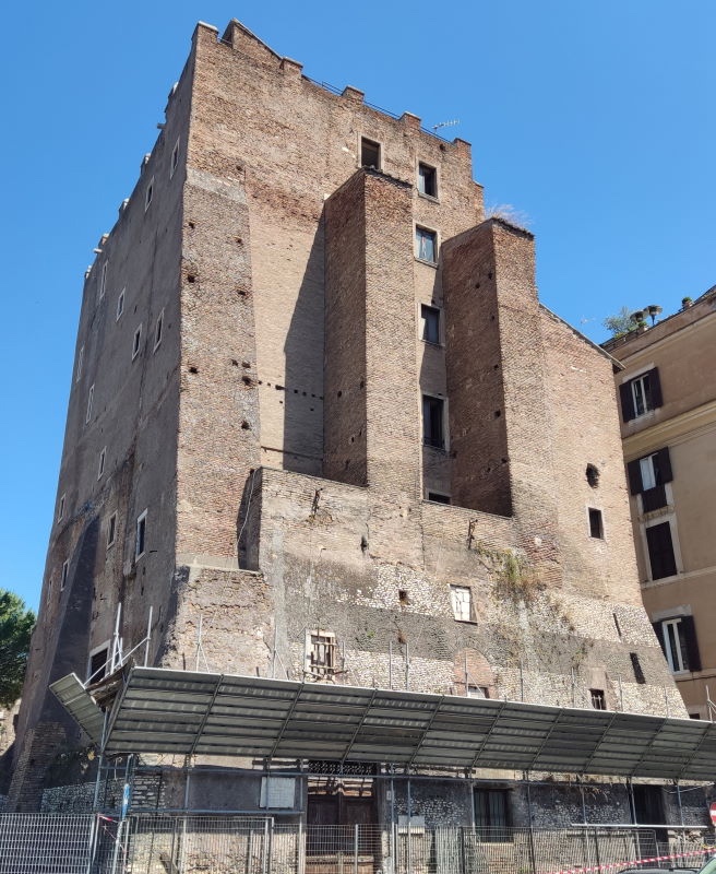 Come si sa dopo il Foro repubblicano di Cesare (46 a.C.), che stabilisce con il suo orientamento una divergenza dal nord pari alla latitudine di Roma (l’angolo rispetto al cardo meridiano è pari a quello dell’altezza del polo celeste sull’orizzonte, orientamento repubblicano seguito dai quattro impianti successivi) quello di Vespasiano è il secondo dei Fori imperiali dopo quello di Augusto (2 a.C.) e prima di quelli di Nerva (Transitorio, 97 d.C.) e di Traiano (112-113 d.C.). Le strutture della prima esedra, antiche di quasi due millenni, finiscono conglobate nella base della torre medievale, insieme ad altra edilizia minore di epoca tardoantica, come la casa «forte dentro e salda fuori» di Pietro di Nicola, soldato. Segue a distanza di due secoli e mezzo, forse nel 1203, l’innalzamento e quasi il rifacimento voluto da Riccardo dei Conti di Segni, fratello di Innocenzo III, secondo Vasari con l’ausilio dell’architetto Marchione Aretino (Vasari ricorda anche le più tarde decorazioni interne, attribuite a Benozzo Gozzoli). In quella data (1203) la torre rastremata a gradi, costituita da tre blocchi parallelepipedi sovrapposti con un raccordo «a cannocchiale» (cc. 40v e 57v del Codex Escurialensis; Escorial, Bibl., 28 II 12), risulta assalita dalle fazioni avversarie al papa, guidate da Giovanni Capocci.