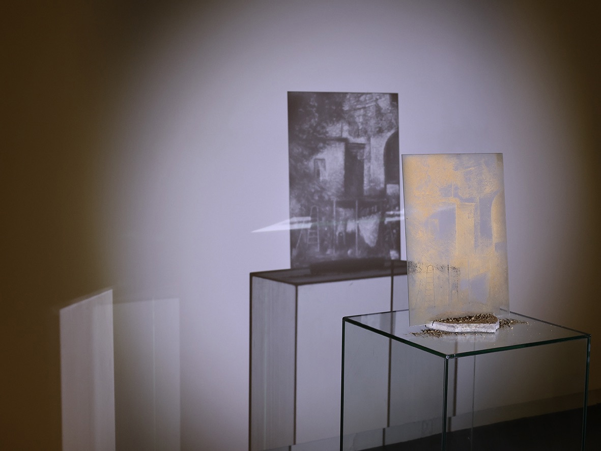 Klausner presenta invece «La maison de l’aqueduc», opera in cui rielabora i graffiti incisi nel 1973 su un frammento d’intonaco delle baracche dell’Acquedotto Felice, demolite l’anno prima. L’artista riporta così alla luce le tracce di una «città nella città», un paesaggio sociale spesso ignorato ma significativo per la storia recente di Roma. Il lavoro diventa così testimonianza visiva e atto di cura verso una memoria marginale ma viva.