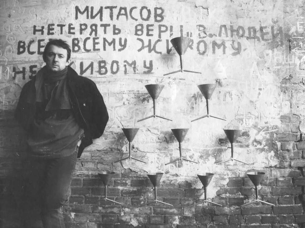 Pavlo Makov accanto a «The Fountain of Exhaustion» allestita sulle pareti della casa di Oleh Mitasov a Kharkiv, 1996 © Pavlo Makov. Cortesia dell'artista
