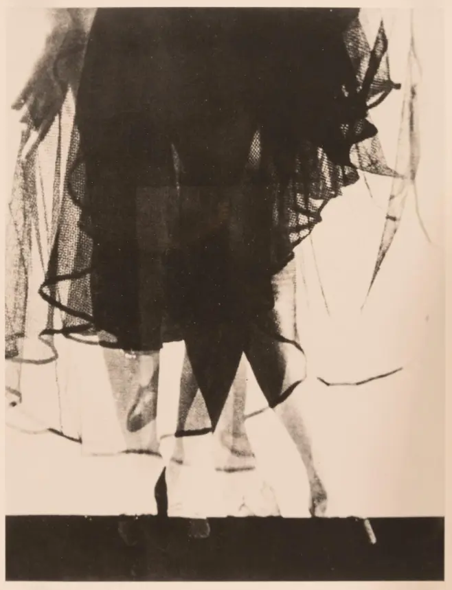 Trieste, città di confine per definizione, è il terreno ideale per queste contaminazioni. Geografica e culturale, attraversata da tensioni e scambi, diventa il contesto in cui l’atelier Wulz si afferma come punto di riferimento visivo e intellettuale. È all’interno di questo ambiente che matura la trasformazione più radicale dell’opera di Wanda. Sul finire degli anni Venti la fotografa inizia ad approfondire il fotodinamismo futurista, anche attraverso la lettura del volume di Anton Giulio Bragaglia, Fotodinamismo futurista. Avvia una serie di sperimentazioni basate sul movimento, sulla sovrapposizione e sulla scomposizione dell’immagine. Tra le opere di questo periodo si colloca «Wunderbar» (1930 ca.), in cui veli trasparenti attraversano la scena, caricandola di un dinamismo quasi immateriale.