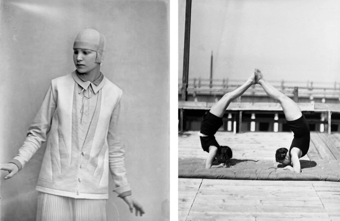 A sinistra: Wanda Wulz, «Ritratto di Marion Wulz con un abito disegnato da Anita Pittoni»,1940 circa. A destra: Wanda Wulz, «Due donne che si allenano, Trieste», 1932 circa. © Archivio Alinari, Firenze / Bridgeman Images. © Alinari/Bridgeman Images.