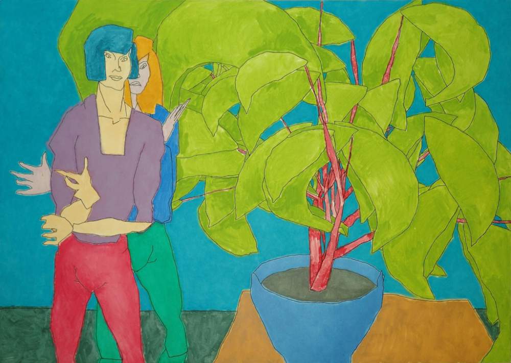 «Two Friends with Potted Plant» (1991) di Harold Cohen e AARON. Cortesia di Tom Machnik / Harold Cohen Trust