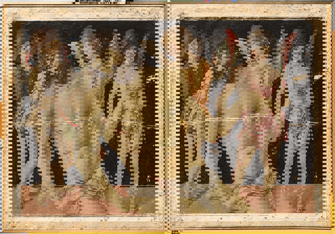 Giovanni Bellini, «Pietà», tassello di pulitura in luce riflessa UV. Photo: Matteo De Fina, Museo della Città «Luigi Tonini», Rimini, per gentile concessione