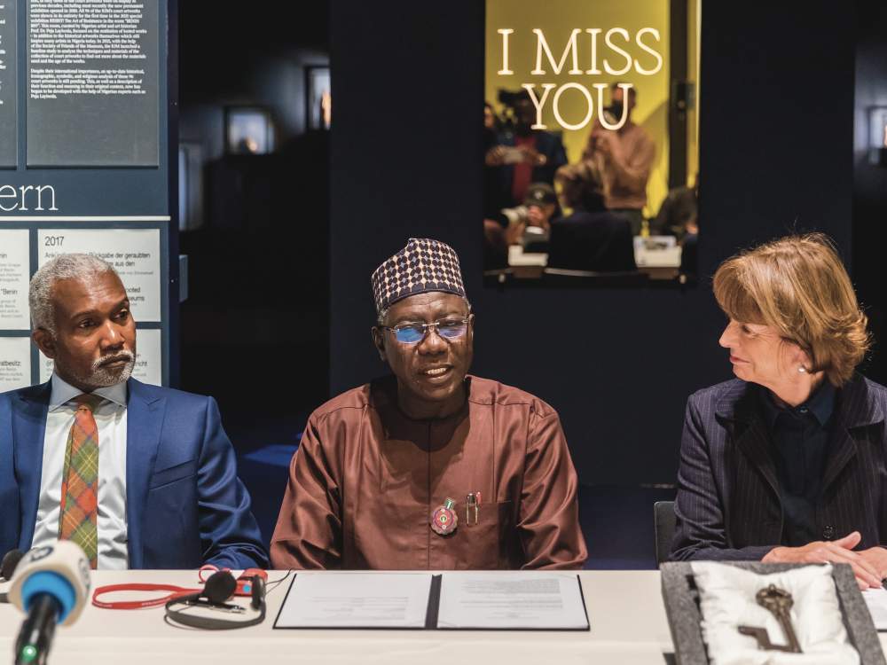 Henriette Reker (a destra), sindaco di Colonia, consegna simbolicamente una chiave di bronzo del Regno del Benin ad Abba Isa Tijani, direttore generale della Commissione nazionale per i musei e i monumenti © Oliver Berg/picture alliance via Getty Images