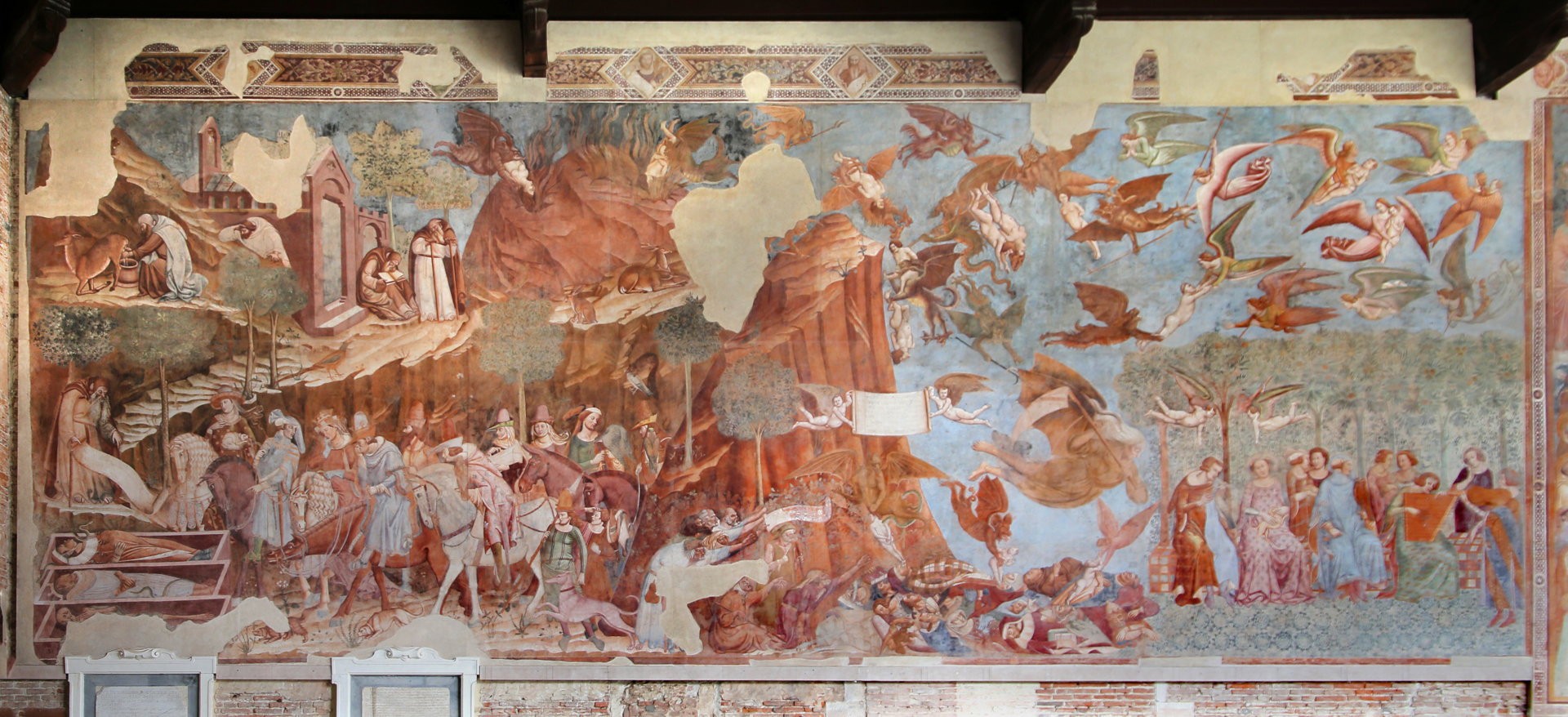 Il primo «Trionfo della Morte» da ricordare è certamente quello di Buonamico Buffalmacco nel Camposanto di Pisa. Enorme affresco, sopravvissuto ai secoli e ai bombardamenti, dipinto fra 1336 e 1341, raffigura un impressionante trionfo della morte popolato da centinaia di figure L’orrida morte dalle ali di pipistrello, capelli bianchi scarmigliati e piedi uncinati, si abbatte sugli umani che sono intenti alle loro attività. E sono soprattutto giovani, immersi in momenti di piacere, ignari del loro destino, come le eleganti dame e i cavalieri che vanno a caccia o ascoltano musica e amoreggiano in un giardino, certo non desiderosi della morte. La morte ignora le suppliche di un gruppo di mendicanti e storpi che la invoca dicendo: «Dacché Prosperitade ci ha lasciati, O Morte, Medicina d’ogni pena, dah vieni a darne ormai l’ultima cena». Si va a scagliare invece contro un gruppo di ragazzi, ricchi, giovani, belli, che stanno lieti in un boschetto d’amore a suonare, corteggiarsi, giocare con bestiole domestiche: saranno le sue prossime vittime. Sulla sinistra della scena altri giovani dame e cavalieri tratteggiano il contrasto fra i vivi e i morti, quando durante una battuta di caccia, signore e nobiluomini a cavallo accompagnati da servitori, falconieri e cani, rimangono atterriti nell’imbattersi in tre bare contenenti tre corpi in diverso stato di decomposizione. I diversi atteggiamenti dei personaggi, compresi quelli dei bellissimi cavalli di razza sono resi in maniera intensa e realistica. A loro si avvicina un eremita che li mette in guardia contro la pericolosità di una vita vissuta negli eccessi: nel cartiglio che tiene in mano si leggeva, infatti: «Se nostra mentre fia [sic] ben accorta tenendo fiso qui la vista afitta, la vanagloria vi sarà sconfitta la superbia, come vedete, morta. V’accorgete ancor di questa sorta se osservate la legge che v’è scritta». Una dura lezione.