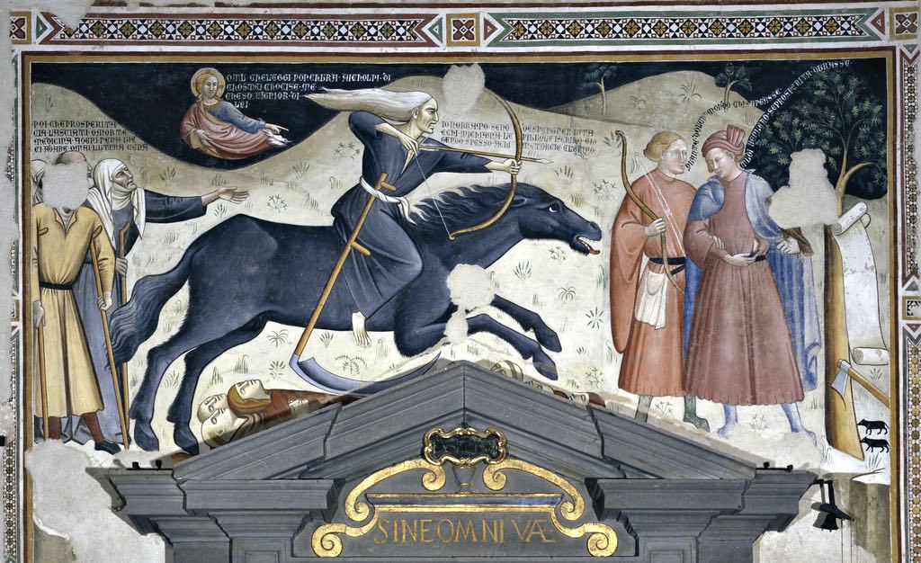 Sempre in Toscana, spostandoci a Sud, andando nell’interno, sotto Siena, troviamo un secondo «Trionfo della Morte» a Lucignano (Si) dipinto da Bartolo di Fredi verso il 1360, nella Chiesa di San Francesco. Anche qui, sia pur in dimensioni molto ridotte rispetto a Pisa, campeggia la Morte, sul suo cavallo nero lanciato al galoppo, in un paesaggio delle crete senesi. La Morte è una vecchia dal volto scavato, con capelli bianchi al vento e lunghe unghie ad artiglio. Dalla cintura bianca, che lega alla vita la sua tunica nera, pende una falce affilata. Sta per scoccare una freccia e proclama a gran voce le sue volontà: «Io non bramo se non di spegner vita / e chi mi chiama le più volte schivo / giungendo spesso a chi mi torce il grifo». Infatti le sue frecce mortali sono rivolte contro una coppia di giovin signori, di aspetto nobile con ricche vesti, impegnati in una battuta di caccia. I due conversano spensieratamente ed elogiano la loro prosperità: «Quant’è dolcie mondo a chi s’apagasse / Tu dì ben vero se prosperità durasse». Ma nella conversazione serpeggia leggera l’inquietudine circa l’auspicio che tutto possa durare: infatti sta per finire nel peggiore dei modi. Paradossalmente la morte non tocca il gruppo di pezzenti, storpi e invalidi che pure la invoca a gran voce per porre finalmente fine alle proprie sofferenze con la stessa invocazione che hanno i miserabili del camposanto di Pisa.