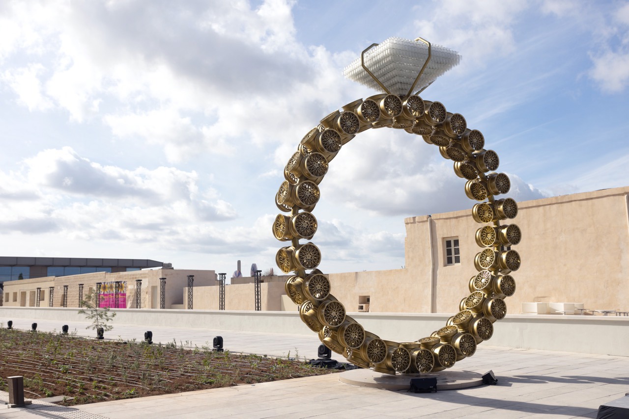 Leggi i suoi articoliL’ingresso al Micas, acronimo per Malta International Contemporary Arts Space, il nuovo luminoso museo per l’arte contemporanea che ha da poco aperto le porte a Floriana, non lontano dalla capitale La Valletta, è segnato dal monumentale «Solitaire» di Joana Vasconcelos, un anello di diamanti composto da 110 cerchioni d'oro sormontato da una piramide di 1.450 bicchieri da whisky di cristallo. Si avanza incontrando «The Radiant» dell'artista svizzero Ugo Rondinone, gigantesco uomo di pietra, mentre svettano sui bastioni, visibili anche dal mare, i grandi dischi di «What is to become is already there» dell'artista britannico Conrad Shawcross. Si guadagna infine l’entrata progettata, insieme al bookshop, dal duo italiano Formafantasma.