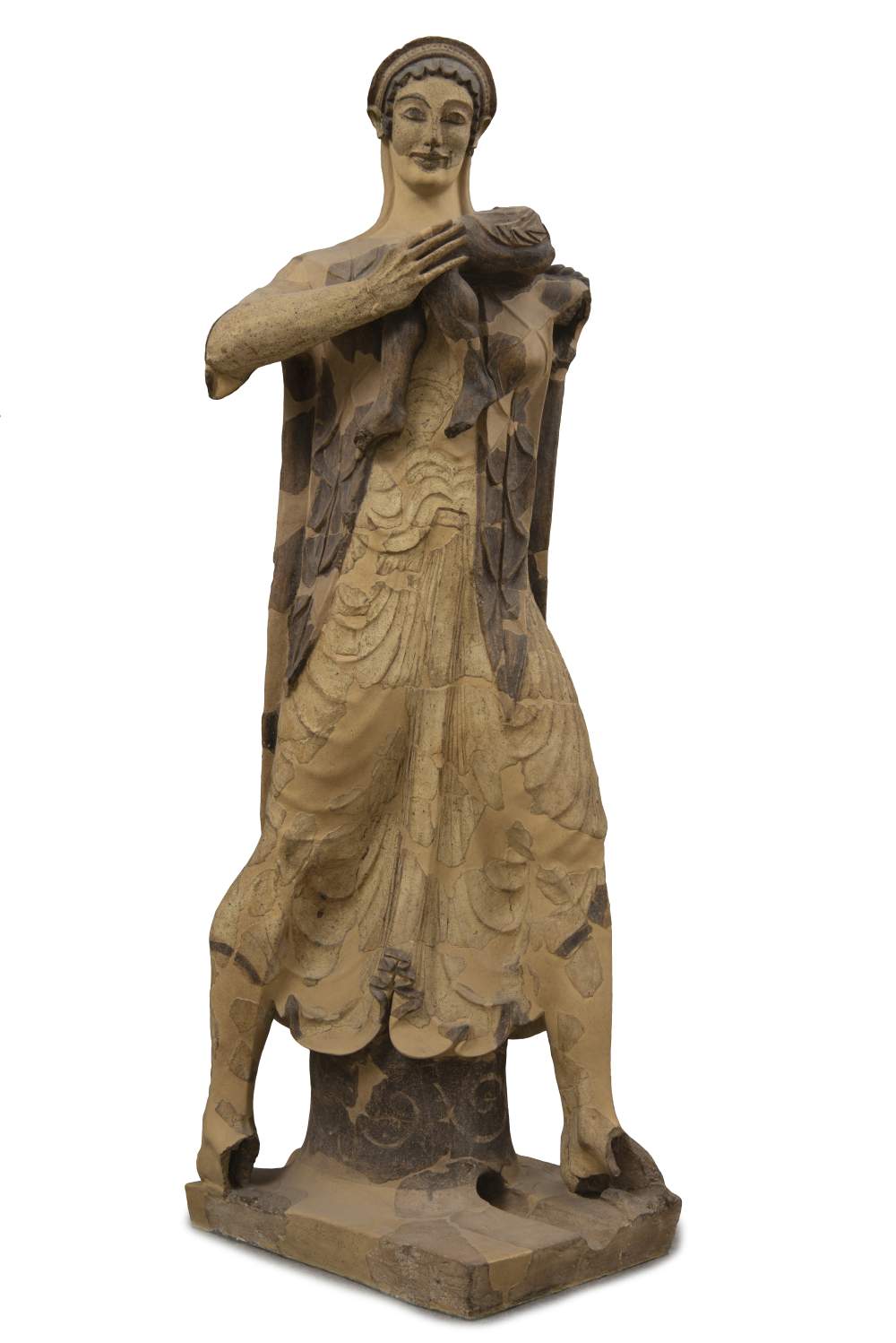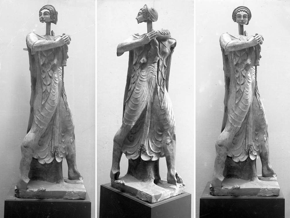 La pulizia delle superfici, aggiunge Lamonaca, ha rivelato una differenziazione di colori più marcata, come per l’orlo della veste, che rende la figura molto più leggibile. E le pennellate ritrovate, che accompagnano le pieghe plastiche del mantello, insieme ai particolari del copricapo, restituiscono un intento pittorico sorprendente, un senso di morbidezza delle stoffe quasi assente nelle altre statue. Per quanto, come si deduce nel modo di modellare l’argilla, l’artista sia lo stesso: un seguace del geniale Vulca di una o due generazioni seguenti, identificato da Giovanni Colonna nel «Veiente esperto di coroplastica», a cui Tarquinio il Superbo commissionò la quadriga sul tetto del Tempio di Giove Capitolino inaugurato nel 508 a.C.