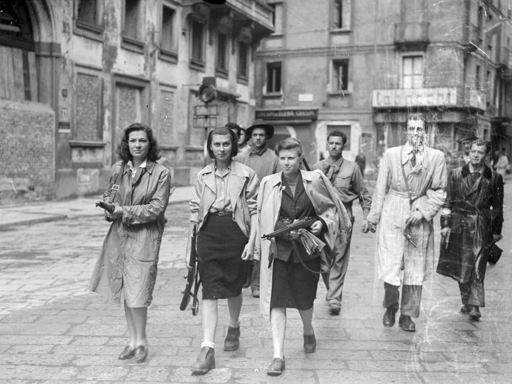 Tre ragazze aggregate a gruppi di partigiani in piazza Brera mentre perlustrano la città insieme ai «gappisti», 26 aprile 1945, fotografia di Tino Petrelli