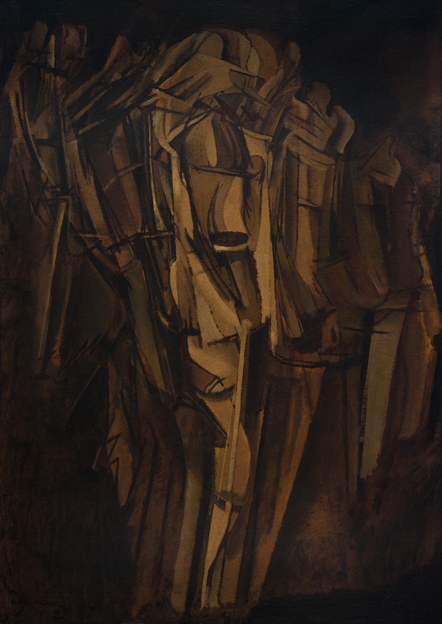 «Nu descendent une escalier» è una sorta di figura cubofuturista però eretica rispetto al Cubismo e al Futurismo. Quello che c’è su quella tela non è una creatura reale, di quelle che Picasso, Braque e seguaci scomponevano per mostrarcele come esse sono e non come appaiono alla percezione ottica dell’osservatore. E mentre a Parigi i cubisti sintetici cominciavano a incollare sulle tele frammenti «trouvé» che portassero nella pittura la vita reale, il manichino di Duchamp vive in un mondo che non ha nulla a che fare con la realtà; è il mondo in cui la pittura è scienza, speculazione intellettuale. «Ho voluto creare un’immagine statica del movimento. Il movimento è un’astrazione, una deduzione articolata all’interno del quadro senza essere tenuti a sapere se un personaggio reale scende o non scende una scala altrettanto reale. In fondo, il movimento è l’occhio dello spettatore che lo incorpora nel quadro». Alla faccia della retorica della velocità futurista, e della fobia marinettiana per il nudo in quanto, appunto, figura appartenente all’arte classica. E sebbene le cronofotografie di Marey e le fotografie in movimento di Muybridge fossero note a Duchamp, il colpo di coda quel quadro lo infligge nel momento in cui ci si ricorda che, in pittura o scultura, un nudo sta tradizionalmente fermo, è quasi sempre in posa (magari eroica), in piedi o disteso; quello di Duchamp è l’anti Olympia di Manet: «scende le scale».