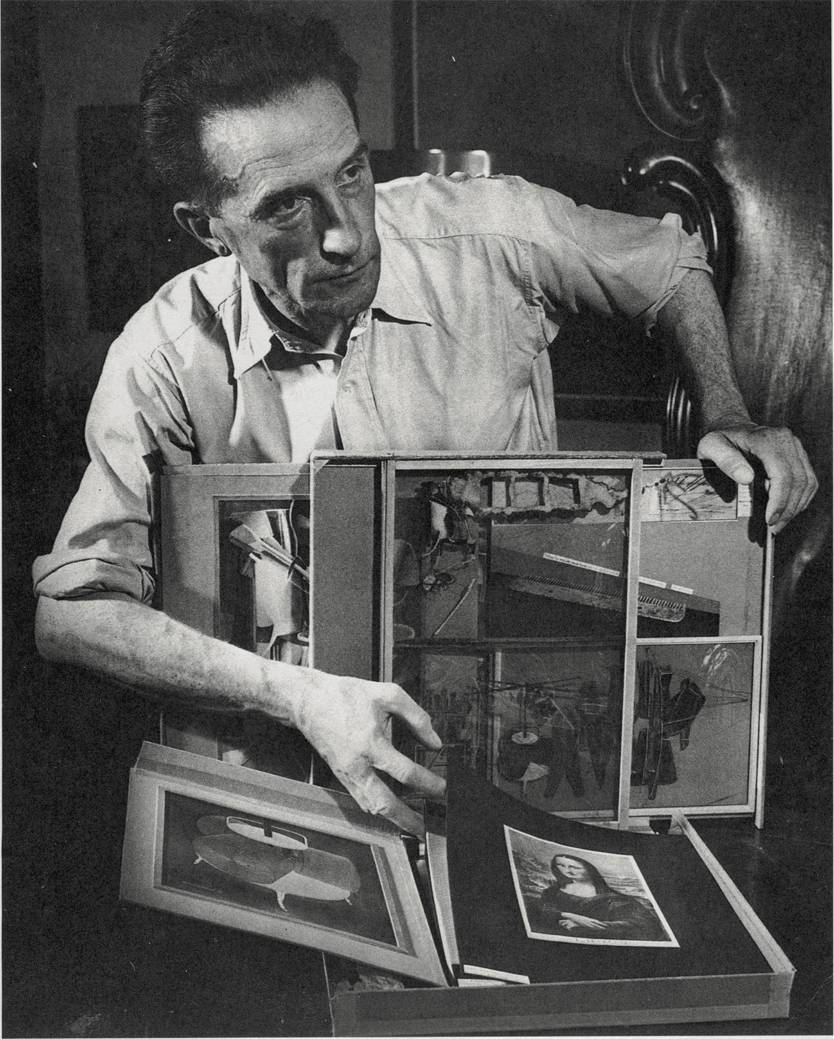 Marcel Duchamp con un esempio incompleto della «Scatola in valigia» nella residenza di Peggy Guggenheim a New York, agosto 1942. L’immagine, di fotografo non identificato, è pubblicata in «Time», 7 settembre 1942, p. 102