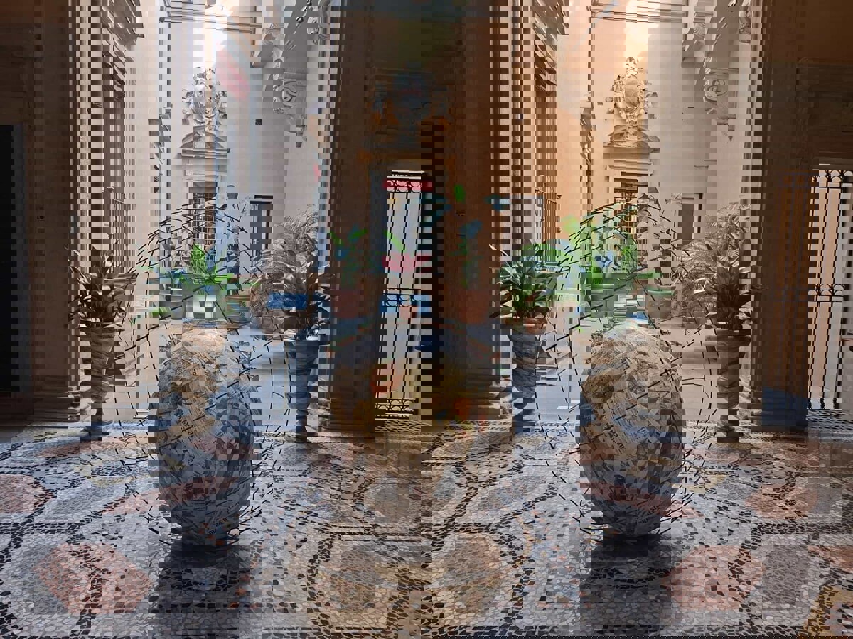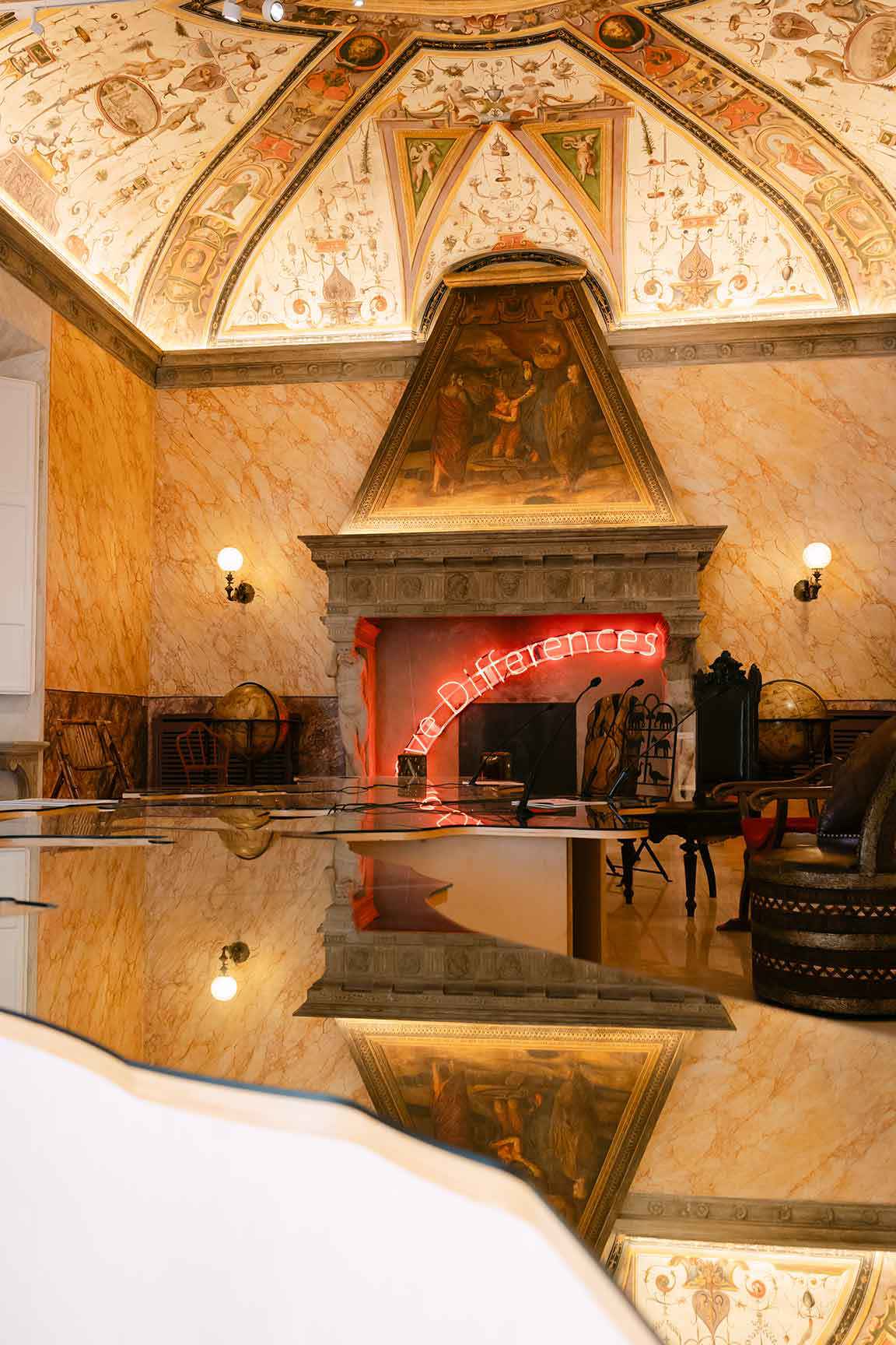 Elemento centrale della mostra il Tavolo Love Difference, nella Sala delle Udienze Papali. Opera, simbolo del movimento Love Difference – Movimento Artistico per una Politica InterMediterranea, è un tavolo specchiante a forma di bacino del Mediterraneo, circondato da sedie provenienti dai Paesi affacciati su questo mare. Attorno al Tavolo si sviluppa il Public Program «Conversazioni intorno al Tavolo Love Difference», curato da Chiara Belliti, con incontri dedicati ad arte, spiritualità, religione, etica, politica, intelligenza artificiale e moda sostenibile come responsabilità culturale e sociale. Procedendo nel percorso emergono le opere che segnano il passaggio verso la ridefinizione del concetto di materia ed energia propria dell’Arte Povera. La Venere degli stracci introduce una frattura simbolica: il dialogo tra la figura classica e l’accumulo di materiali di scarto che non si presenta, però, come rottura con la storia, ma come rinegoziazione del rapporto tra cultura e produzione industriale. Inserita in uno spazio che conserva riferimenti al potere storico, l’opera genera una tensione tra due sistemi di valore: quello della tradizione culturale e quello della società dei consumi, suscitando una riflessione sul destino degli oggetti e sul ruolo dell’arte nel sistema economico. Il percorso prosegue poi con lavori che segnano l’espansione del pensiero di Pistoletto verso la dimensione sociale e politica. Il Mappamondo riflette sul mondo come oggetto che può essere spostato, attraversato, riequilibrato. All’interno del percorso espositivo diventa passaggio simbolico tra dimensione personale e dimensione planetaria, anticipando progetti in cui l’arte si configura come strumento di trasformazione sociale. Questo processo trova sintesi nel Tavolo Love Difference, dove il dialogo tra opera e architettura raggiunge un’intensità ulteriore diventando il tavolo un dispositivo di incontro, discussione e costruzione di responsabilità condivise. Lo spazio che un tempo ospitava il potere spirituale diventa luogo di confronto tra soggetti diversi, senza gerarchie precostituite, attivando una riflessione sul ruolo delle istituzioni nel presente e sulla possibilità di immaginare nuove forme di partecipazione politica e culturale. Una dimensione partecipativa che si sviluppa anche attraverso il programma di incontri che estendono il progetto oltre l’oggetto artistico. In questo modo la mostra supera la dimensione espositiva e si proietta nel dibattito pubblico.