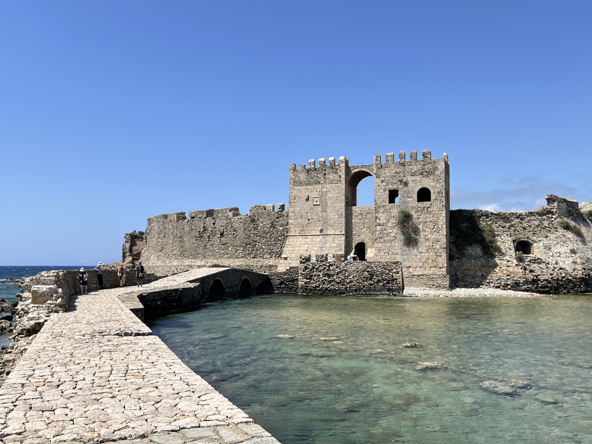 La Serenissima fece di Modone (come anche della sua gemella, Corone, ubicata nell’angolo sud-orientale del Peloponneso) un importante porto di scalo per le navi mercantili e fortificò la città per difenderla dalle minacce che venivano dalla sponda sud del Mediterraneo e poi, in modo sempre crescente e minaccioso, dai Turchi che avevano gradualmente occupato l’Impero bizantino. Proprio nel corso delle guerre contro i Turchi (ben sei in tre secoli) i Veneziani persero gradualmente gran parte del loro impero marittimo, compresa Modone, turca dall’anno 1500. I Turchi ne ampliarono le fortificazioni, così resistendo ai tentativi di riconquista condotti nel 1531 dai Cavalieri di Malta e successivamente, dopo la vittoria alla battaglia di Lepanto (1571), dal comandante della flotta cristiana, don Giovanni d’Austria, il figlio illegittimo del re di Spagna, l’imperatore Carlo V. Ma fu in occasione della sesta guerra turco-veneziana, chiamata la guerra di Morea, che nel 1686 Venezia riuscì a riconquistare Modone e gradualmente tutto il Peloponneso sotto il comando dell’ammiraglio (e futuro doge) Francesco Morosini, chiamato da allora «il Peloponnesiaco». Venezia non risparmiò spese ed energie per dotare Modone di nuove e poderose fortificazioni, adatte a resistere alla potenza delle armi da fuoco delle flotte dell’epoca. Questa riconquista si dimostrò tuttavia effimera, e nel 1715 i Turchi occuparono nuovamente tutta la Morea e anche Modone, che rimase in loro possesso fino allo scoppio alla Guerra di indipendenza greca (1821-29), quando la città, che si era ribellata ai Turchi, subì massicce distruzioni (1825). Così gravi che si decise di ricostruire la città fuori dalle mura, utilizzando le pietre antiche per le nuove edificazioni. Da allora, la fortezza non venne più utilizzata, ma le sue imponenti fortificazioni e molti dei suoi monumenti sopravvissero e giunsero in buone condizioni fino all’epoca attuale.