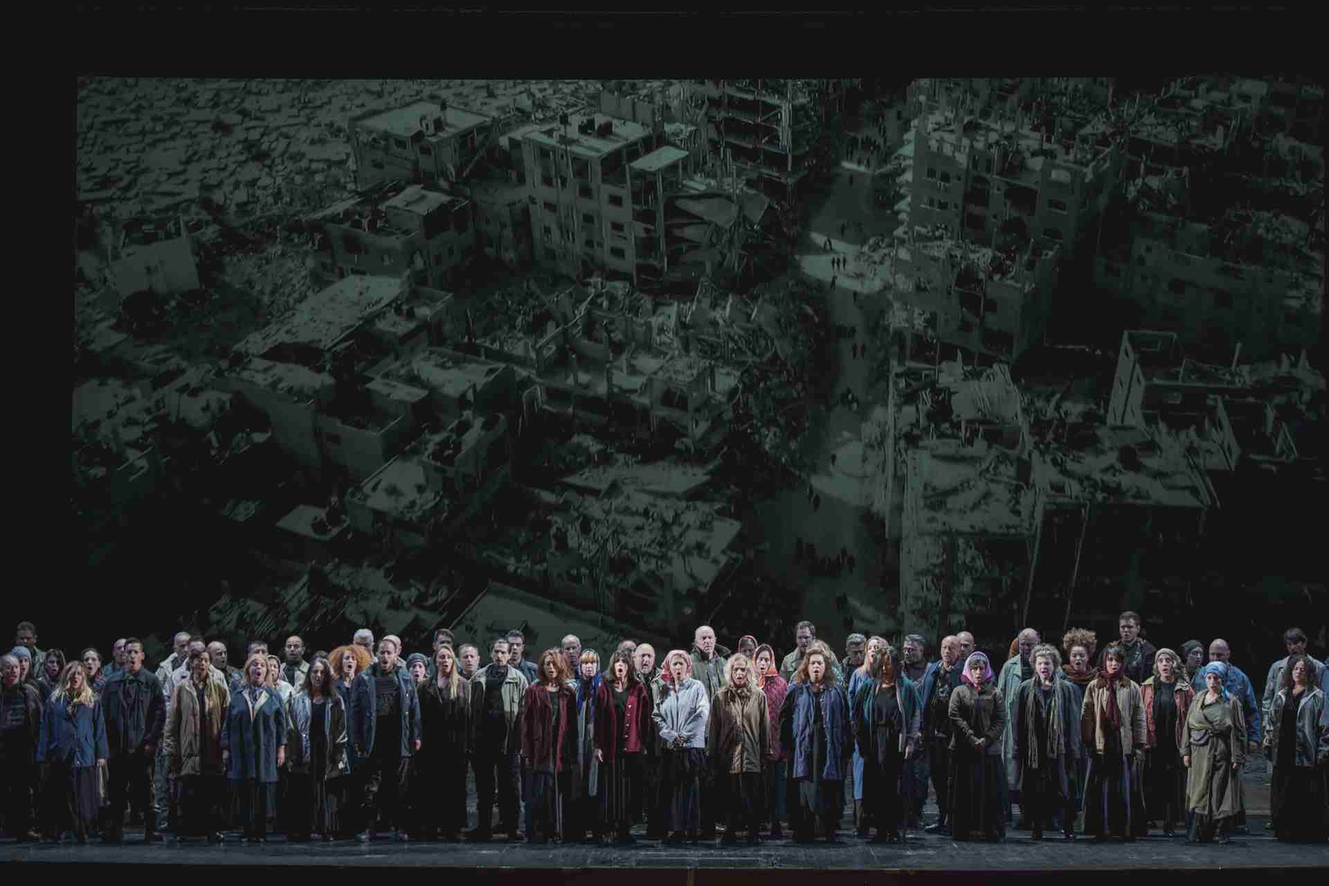 Per fortuna alla replica a cui ho assistito io (le recite si sono tenute dal 12 al 19 ottobre, Ndr) i «buu» non si sono ripetuti e il folto pubblico fiorentino ha invece lungamente applaudito la regia, che si è magnificamente avvalsa delle scene dell’artista Mimmo Paladino. A cominciare dal dipinto iniziale, che tanto ci ricordava il Trionfo della Morte (1440-45 ca) conservato nella Galleria di Palazzo Abatellis a Palermo, affresco che si pensa abbia ispirato la celeberrima «Guernica» di Picasso, manifesto dell’artista spagnolo contro gli orrori della guerra. Come nel «Trionfo» siciliano, anche nel grande sipario di Paladino al centro della composizione appare uno spettrale cavallo: è quello della morte, scarnificato come fosse appena uscito da una tomba scoperchiata. Uno scheletro umano cavalca la bestia e la guida per il mondo volando sopra una selva di volti terrorizzati e di braccia imploranti, di teschi e di corpi smembrati, di figure grottesche e inquietanti. Sono tutti, indistintamente, vittime della morte: re, papi, imperatori, generali, governanti e gran signori, uomini e donne, giovani e vecchi, ricchi e poveracci. Sono ombre accerchiate da lingue di fuoco, destinate a essere travolte dalla ineluttabile infernale cavalcata. In alto, verso destra, si intravede una lampada accesa. È come quella di «Guernica», ci ricorda Sergio Risaliti (direttore de Museo del Novecento di Firenze nel suo saggio allegato al libretto), una piccola immagine di speranza in un mondo giunto alla fine della storia.