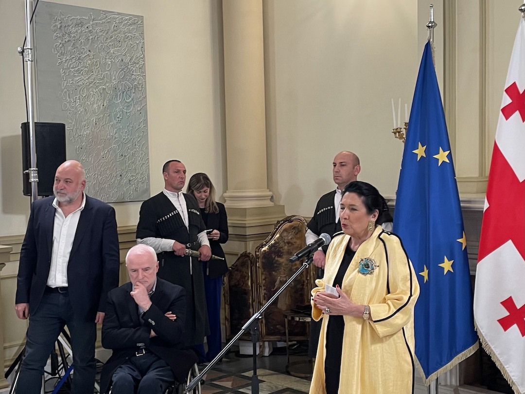 Il 13 aprile Zourabachvili ha organizzato nel palazzo presidenziale una festa per gli artisti, i mercanti, i curatori, i giornalisti e i Vip della fiera d’arte di Tbilisi, TAF24, svoltasi dall’11 al 14 aprile; nel corso del ricevimento un coro maschile ha intonato un canto nell’antica e commovente polifonia della musica georgiana che man mano si è trasformato nell’Inno alla gioia di Beethoven, l’inno dell’Unione Europea. Si è trattato di una poco velata dichiarazione politica a sostegno del popolo georgiano, la cui maggioranza crede che il futuro e la libertà siano nell’Europa e protesta a gran voce contro il Governo, che vuole ingraziarsi la Russia.