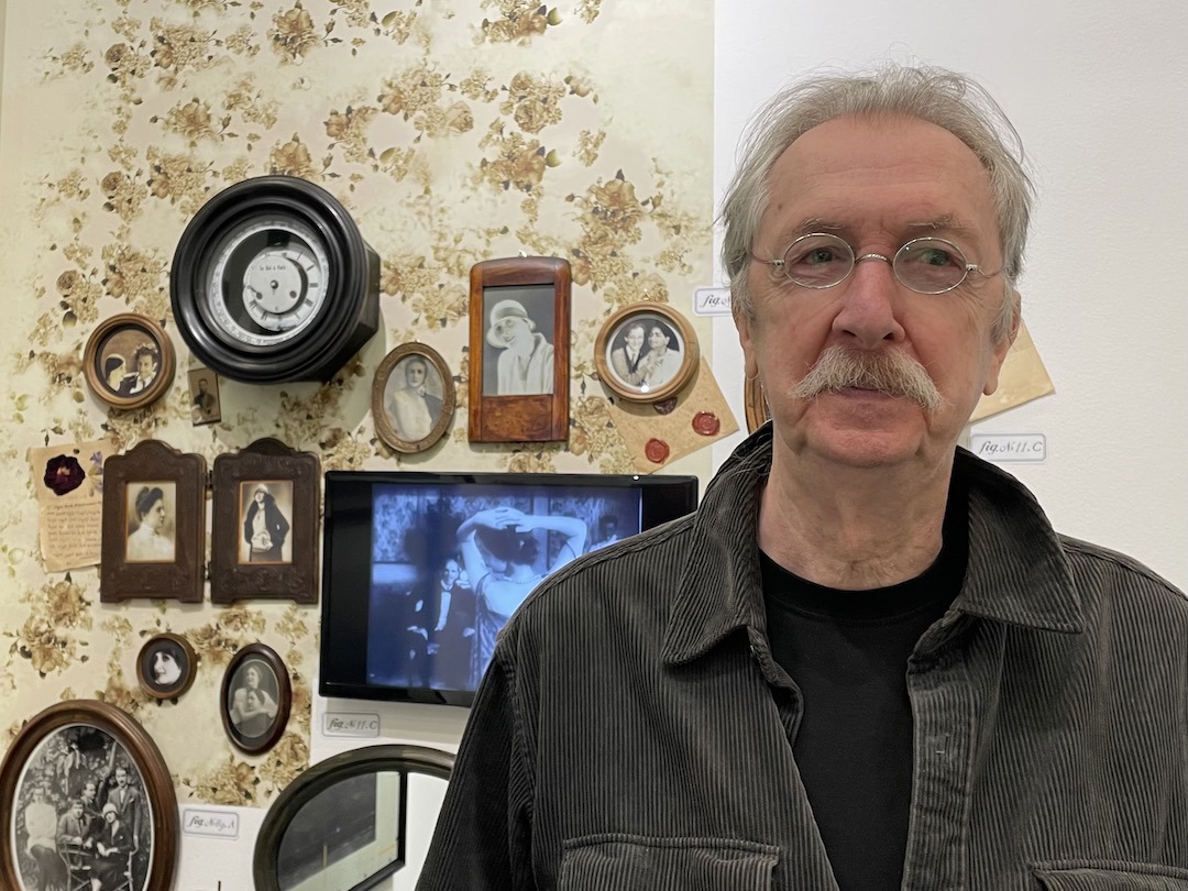 Ho quindi deciso di chiedere a quattro artisti presenti alla fiera di raccontarmi che cosa li abbia spinti a creare. La madre di Levan Mekhuzla, 79 anni, architetto di formazione, era Tamar Bolkvadze, una star del cinema muto e donna di straordinaria bellezza. Il lavoro di Mekhuzla è un assemblaggio di ritratti fotografici attorno a un filmato che ritrae la madre mentre balla, intorno al 1920, davanti a eleganti uomini in abito da sera. All’epoca la lingua della sua classe sociale era il francese e, data la natura nostalgica dell’arte di Mekhuzla, alla fine ci è parso normale parlare tra di noi in francese.