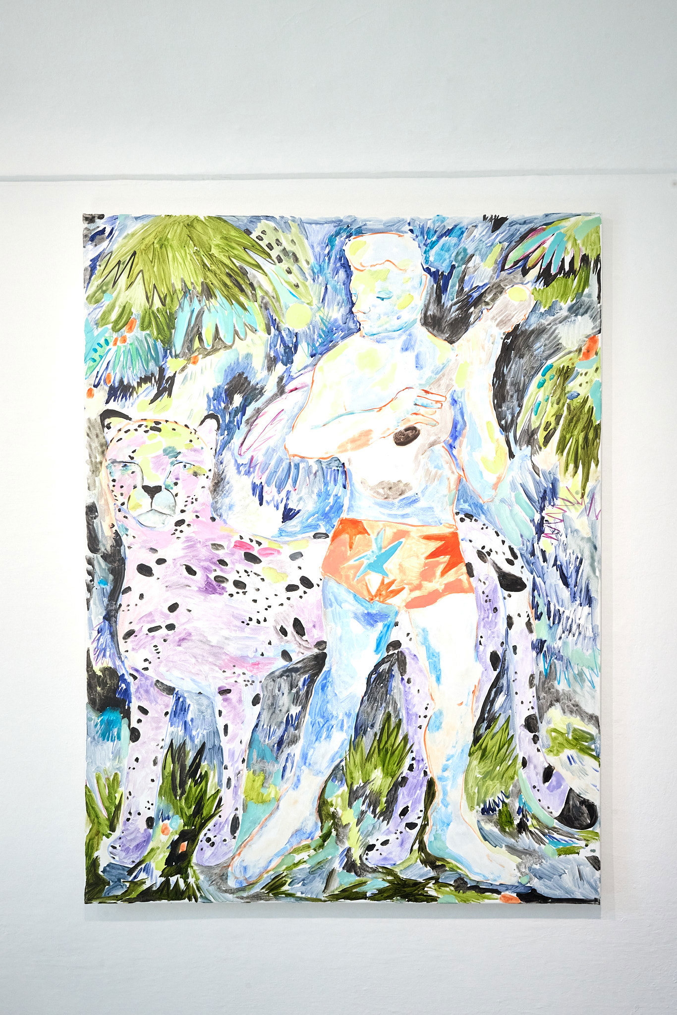 «Orfeo incanta gli animali con la musica» (2019) di Lorenza Boisi, olio su tela, 160x120 cm, Galleria Ribot. Cortesia della Galleria Ribot. Foto Edoardo Piva. Proprietà della Fondazione per l’Arte Moderna e Contemporanea CRT in comodato alla GAM-Galleria Civica d’Arte Moderna e Contemporanea di Torino