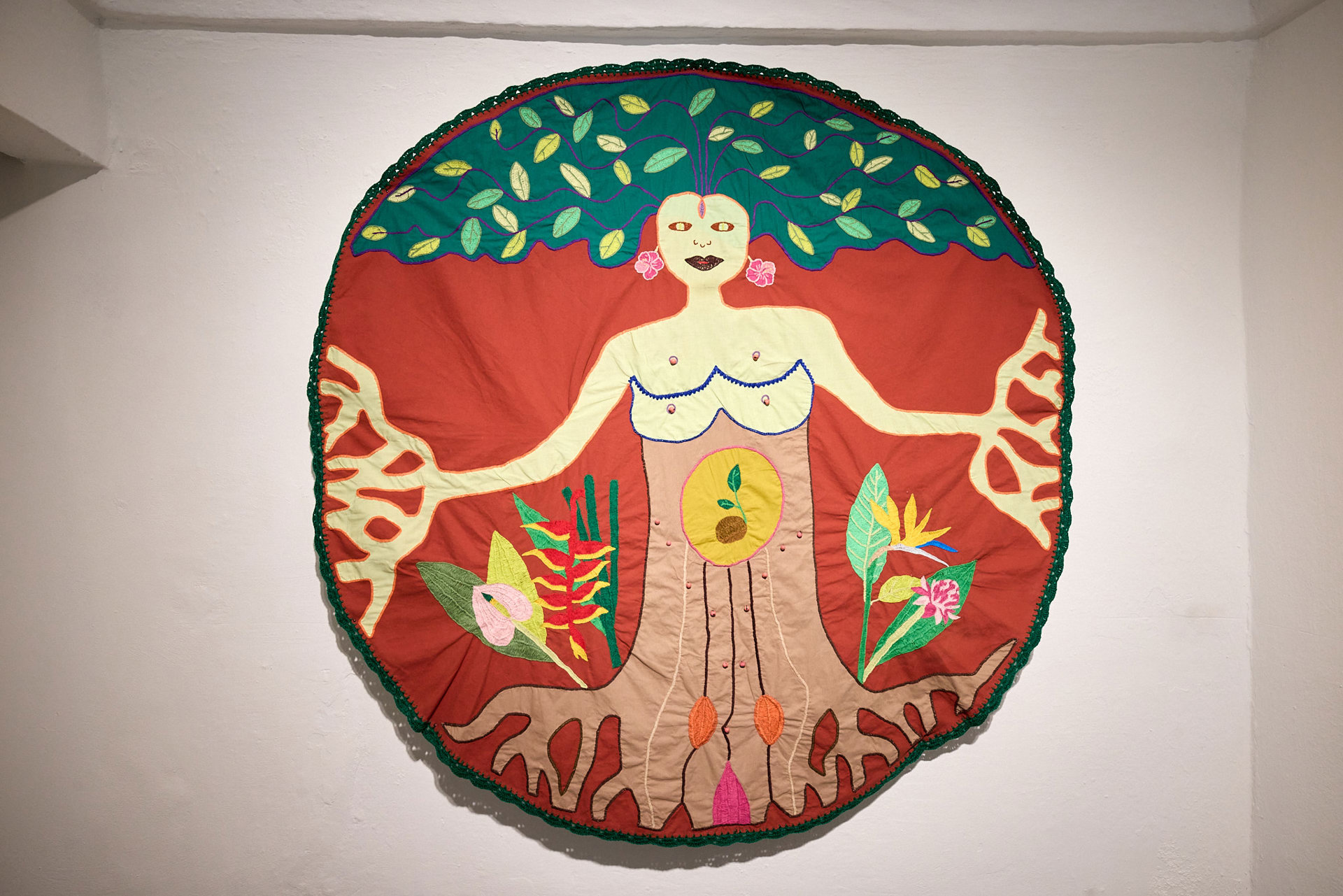 Negli spazi del Centro Civico e Culturale di Rittana, uno stabile utilizzato in passato come canonica del paese, l’esposizione si apre con l’opera tessile «Mother Earth» di Tabita Rezaire, che celebra la maternità e la fertilità e fa parte di una trilogia di opere che raffigurano delle divinità ricamate, realizzate in collaborazione con le donne Saramaka (Guyana francese). «Mother Earth» onora lo spirito della Terra, la sua abbondanza e la sua saggezza, e ci richiama alla responsabilità di prenderci cura dell’ambiente in cui viviamo.
