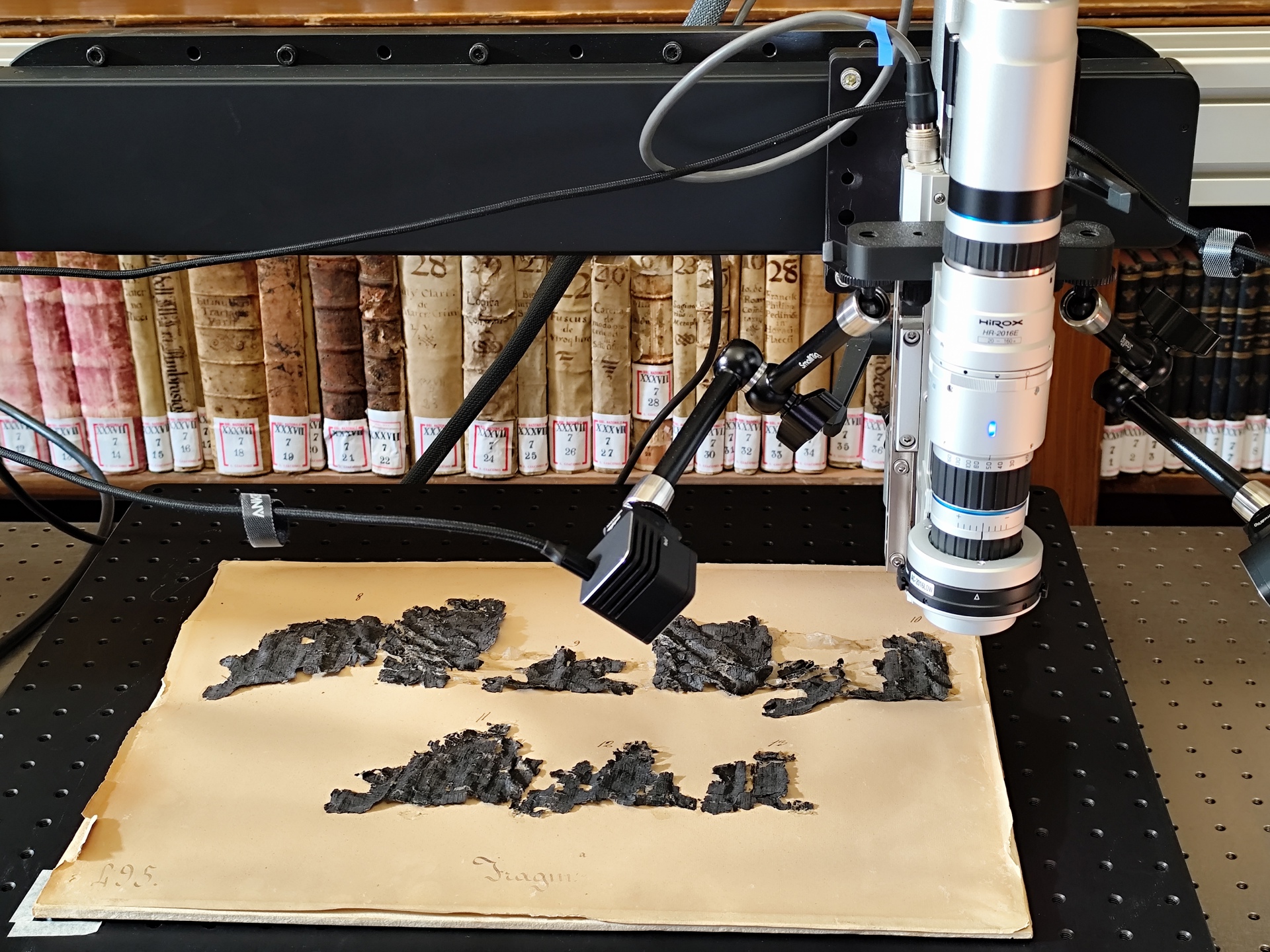 Sofia Ceccarelli, diagnosta dell’Istituto di Scienze del Patrimonio Culturale (Ispc) del Cnr, gestisce le attività di ricerca del progetto dal punto di vista scientifico: «Le tecniche per studiare i beni culturali sono moltissime, tanto da esserci una disciplina chiamata scienza della conservazione; il mio ruolo è individuare quale potrebbe essere più utile e a quale dei papiri applicarla. Il progetto si è evoluto negli anni, si è andati a tentativi perché questa tipologia di manufatto non è mai stata studiata in modo così sistematico. I papiri non possono essere trasportati al di fuori della Biblioteca Nazionale di Napoli, pertanto, abbiamo installato nell’Officina strumentazioni e laboratori fissi, ad esempio un microscopio ad alta risoluzione con un’ottica nell’infrarosso. Grazie a questo tipo di visualizzazione possiamo sfruttare la differenza di proprietà ottiche nell’infrarosso tra il substrato di papiro e l’inchiostro, ricordando che si tratta di superfici carbonizzate, quindi nere, su cui si dovrebbe leggere l’inchiostro anch’esso nero. Il macchinario è stato sviluppato in Giappone e ne sono stati realizzati solo due esemplari, uno per noi e uno per il Vaticano. Il secondo laboratorio fisso comprende la strumentazione per la fotografia tecnica. Usiamo una macchina fotografica modificata alla quale viene tolto il filtro di fabbrica così da poter acquisire immagini nell’infrarosso, nell’ultravioletto e in luce radente ottenendo tre differenti tipologie di informazioni. Alcuni dei risultati preliminari sono stati mostrati a Paestum in occasione dell’ultima edizione di “Archeovirtual”, organizzata dal Cnr Ispc all’interno della Borsa Mediterranea del Turismo Archeologico. Attraverso una modalità di visione virtuale si poteva visualizzare un’immagine ad alta risoluzione del papiro nell’infrarosso per leggerne dei frammenti. Un altro sistema di analisi in situ è la Reflectance transformation imaging (Rti) che consente di ottenere un’immagine iperrealistica con illuminazione variabile e fornisce informazioni sulla sua morfologia, ad esempio dove non aderisce al cartoncino o dove ci possono essere più strati, permettendo anche di identificare lettere tra le pieghe del papiro».