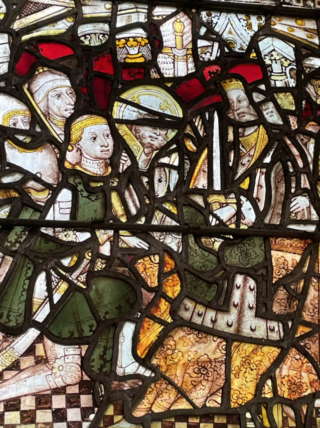 Un dettaglio della vetrata medievale a St Mary Magdalene, Newark-on-Trent, Nottinghamshire