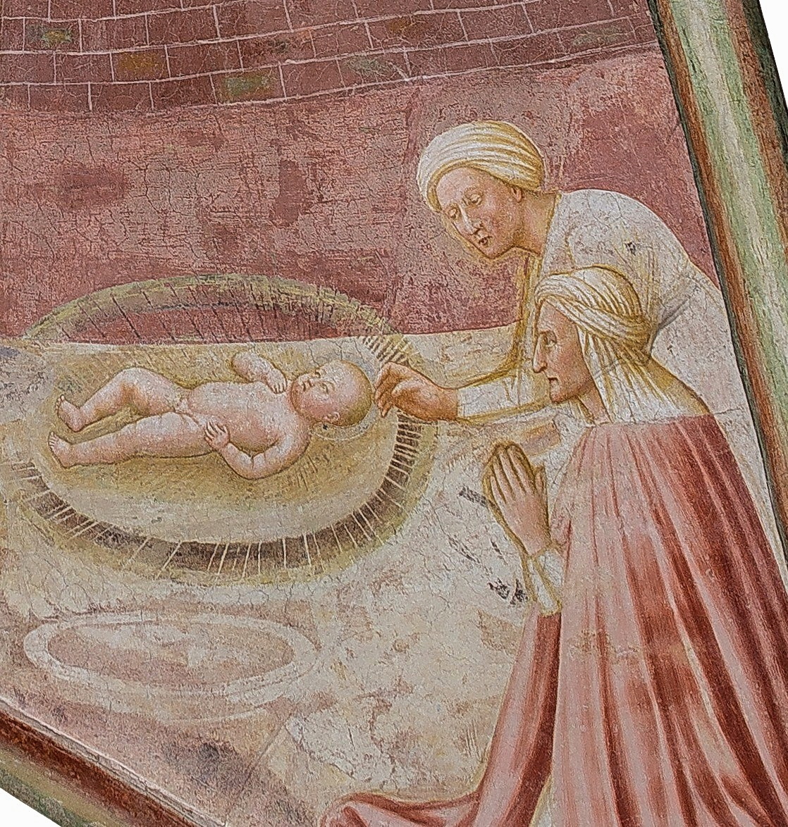 Quando (dopo il XIV secolo) la «Natività» si trasformò in «Adorazione» (con i genitori e altre eventuali figure che, per l’appunto, adorano il piccolo Gesù) le levatrici scomparvero, con qualche eccezione. Come negli affreschi (1435 ca) di Masolino da Panicale nella Collegiata di Castiglione Olona. Appena e miracolosamente uscito dal ventre materno, il neonato è posato a terra entro una culla di luce. Maria, Giuseppe e una donna lo adorano; un’altra, pure inginocchiata, allunga verso di lui una mano orribilmente contratta. A breve si scioglierà e Salomè, a mani giunte, si unirà agli altri per adorare il bambino, avendo accettato il mistero della sua nascita verginale.