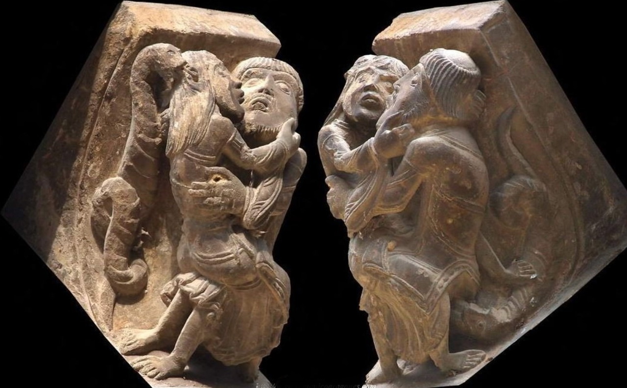 Quello scolpito su una mensola sottogronda all’esterno dell’abside della Chiesa di Santa María a Uncastillo (Saragozza, Spagna) è invece reciproco: e scandalosamente sensuale. Una fanciulla è seduta a gambe aperte sulle ginocchia di un tonsurato e i due, pur vestiti, godono di sfacciata intimità. Un serpente accosta la testa all’orecchio della ragazza, quasi a suggerirle le mosse amorose; un altro si insinua tra le gambe dell’uomo, indirizzandosi proprio là dove il suo sesso freme. Le due bestie sottolineano e denunciano il compiersi del male.