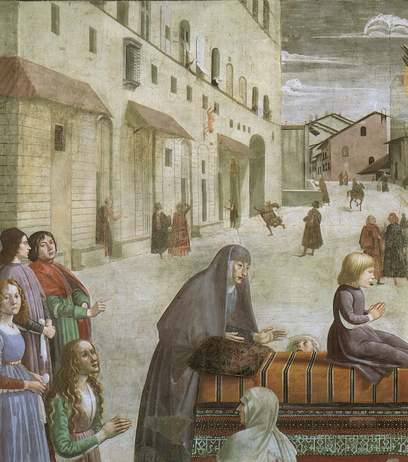Domenico Ghirlandaio, «Miracolo del fanciullo resuscitato», 1485, Firenze, Santa Trinità, Cappella Sassetti. Nel particolare, si vede il bambino precipitare dal balcone e, in primo piano sulla destra, rialzarsi sopra al catafalco