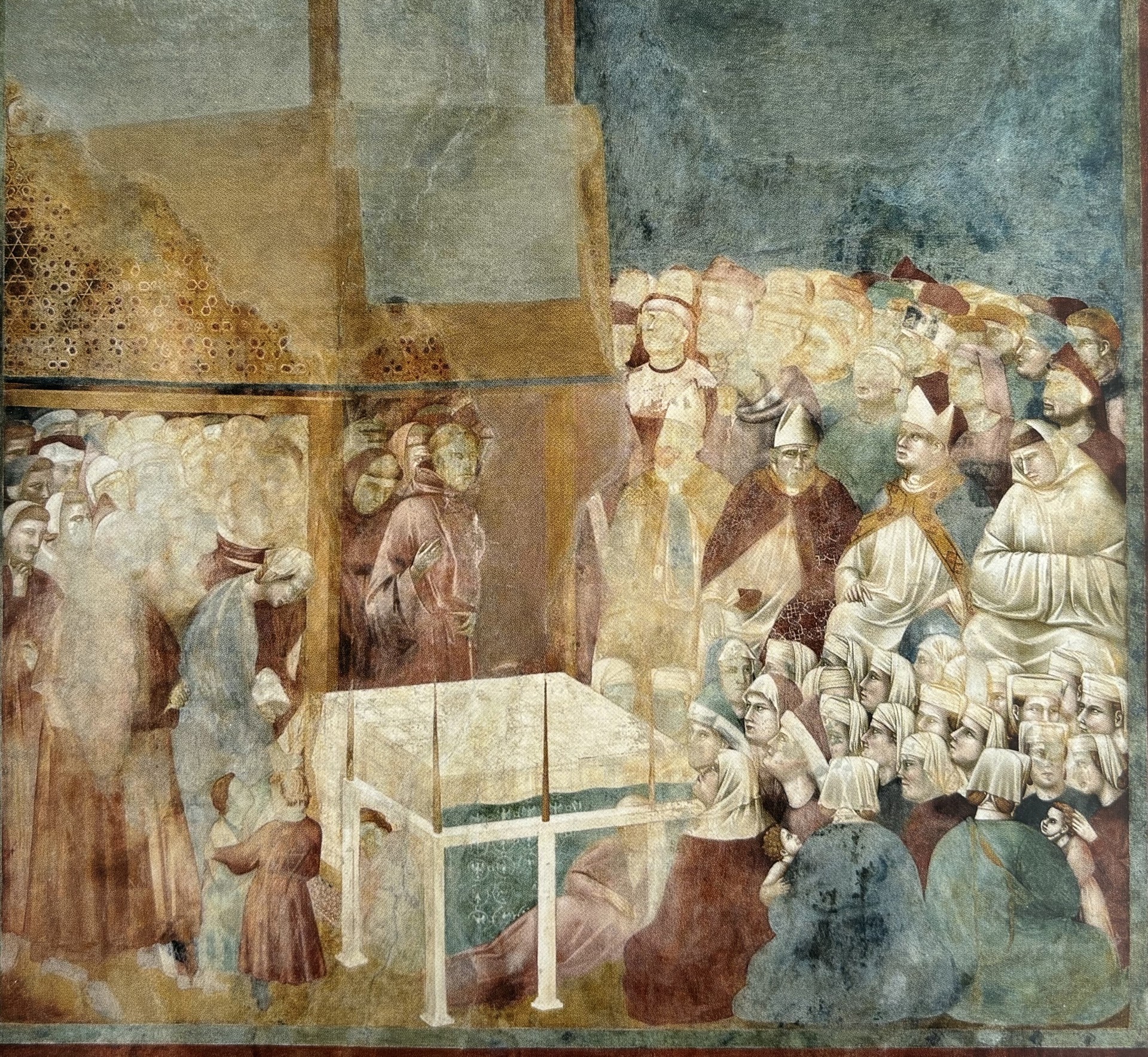 Giotto, «Canonizzazione di san Francesco», 1290-92, Assisi, San Francesco, Basilica superiore. Accanto alla cassa che contiene il corpo del santo si scorge la bambina dal collo torto, Tra il pubblico altri bambini
