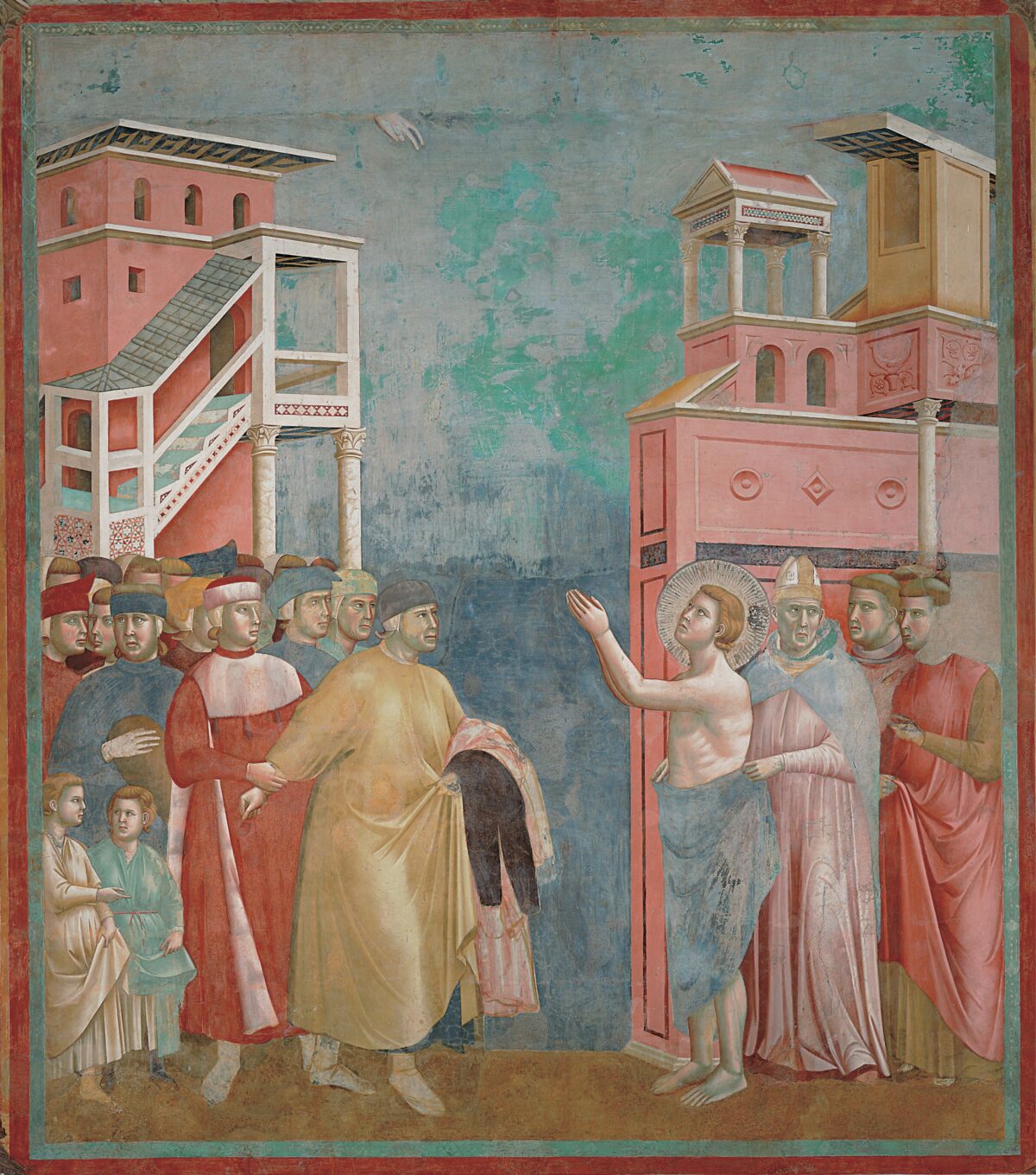 Ai bambini era dunque assegnato il compito iconografico di manifestare, con sincerità infantile, lo sconcerto suscitato dal comportamento del santo, esimendo gli adulti dall’imbarazzo (postumo) di esprimerlo. Postumo perché, a suo tempo, proprio gli adulti «gli lanciavano contro il fango e i sassi delle strade, e, strepitando e schiamazzando, lo insultavano come un pazzo» (Leggenda maggiore); ma, al tempo di Giotto, se ne sarebbero vergognati.