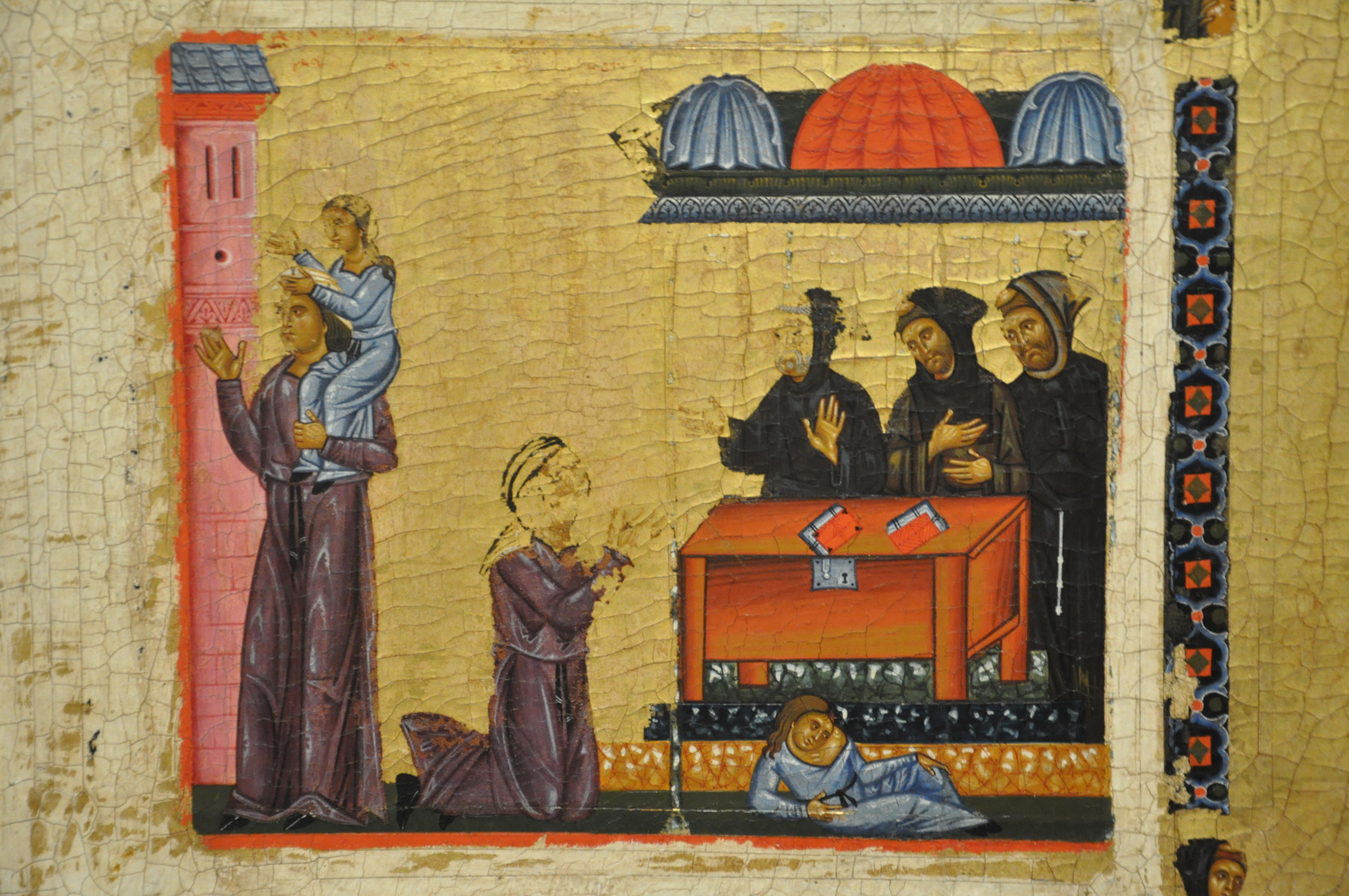 «Miracolo della bambina dal collo torto», da «San Francesco, storie della sua vita e miracoli post mortem», 1255 ca, Pistoia, Museo Civico