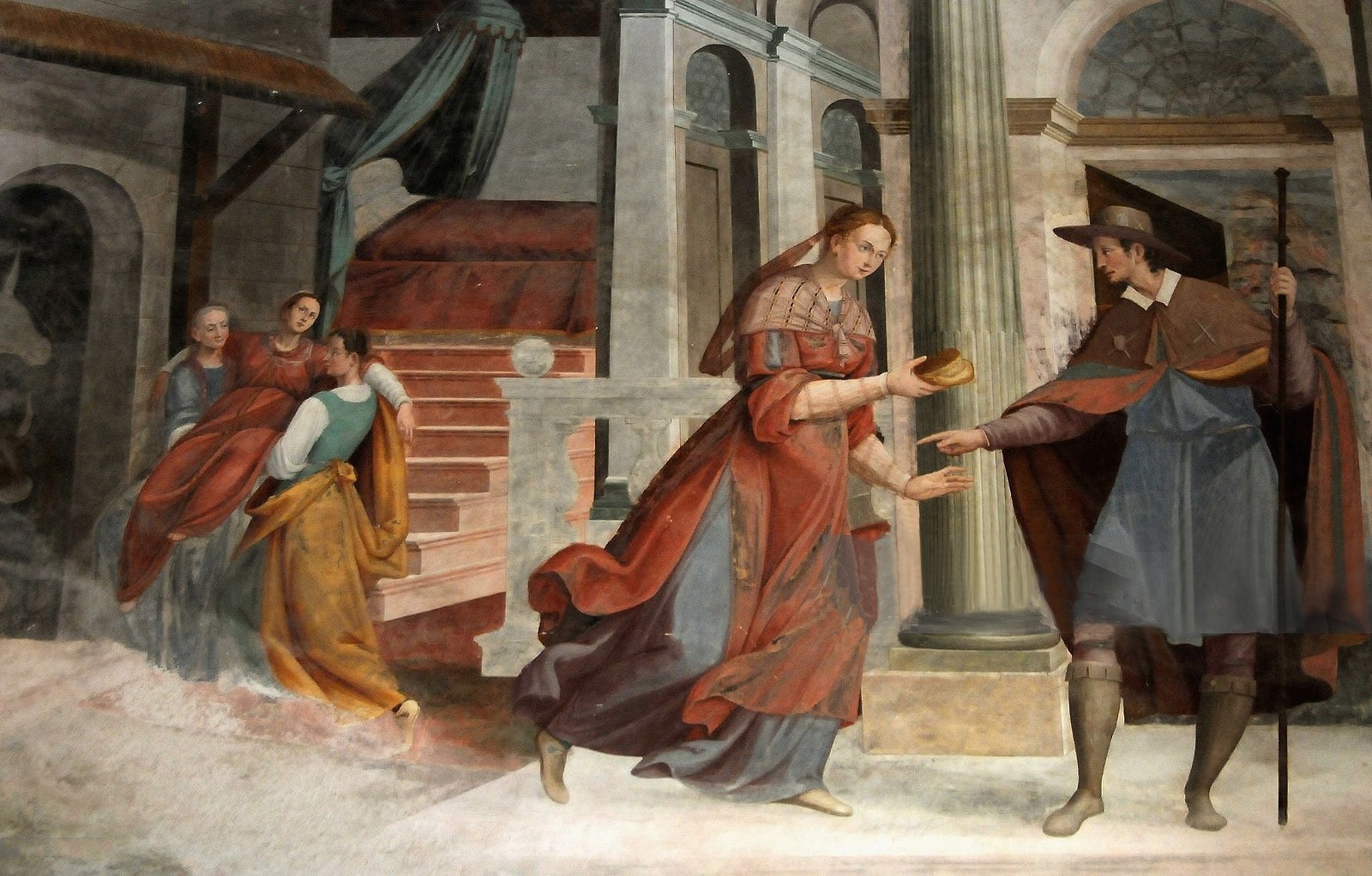 Giacomo Filippo e Bernardo Monti, «Il pellegrino annuncia la nascita di Francesco e la madre è recata di peso nella stalla», entro il 1615, Orta, Sacro Monte, Cappella della Nascita