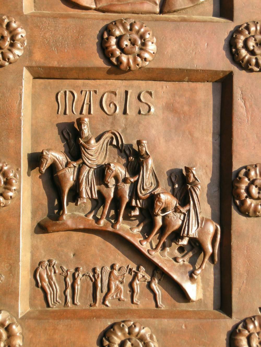 «Il viaggio dei magi» (fine XII secolo) su formella della porta di San Ranieri nella Cattedrale di Santa Maria Assunta, Pisa