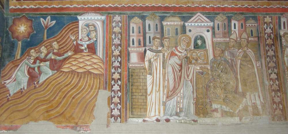 «I messi di Costantino raggiungono Silvestro sul monte Soratte» e «Silvestro mostra a Costantino l’icona dei santi Pietro e Paolo» da «Storie di san Silvestro» (1248 circa) presso l’Oratorio di San Silvestro, complesso dei Santi Quattro Coronati, Roma