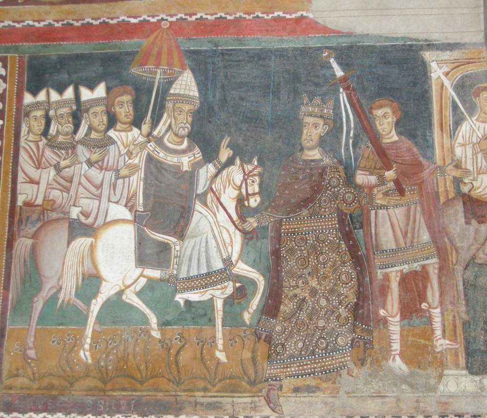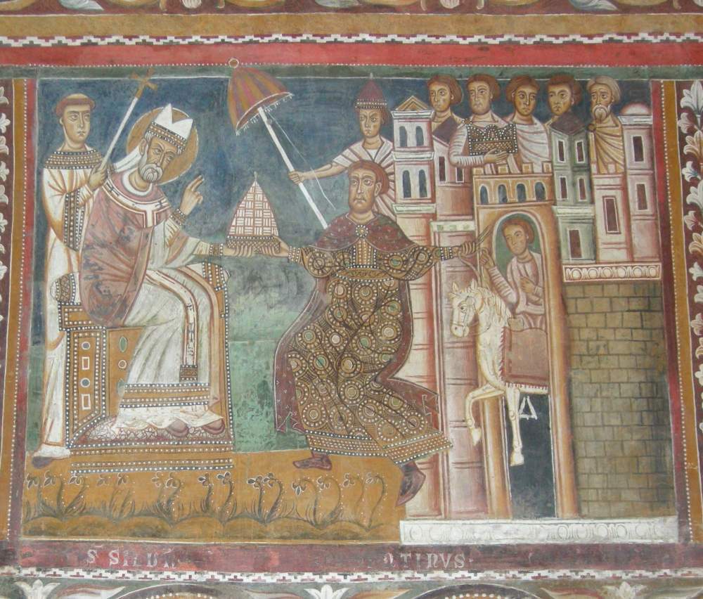 «Costantino consegna a Silvestro le insegne del potere» da «Storie di san Silvestro» (1248 circa) presso l’Oratorio di San Silvestro, complesso dei Santi Quattro Coronati, Roma