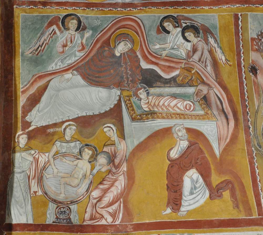 Prostrata (come tutte le puerpere) dal parto, la Vergine si riposa e tristemente riflette, consapevole del destino del figlio che la fasciatura (con cui si avvolgevano anche i morti) e la mangiatoia (a forma di sepolcro) non mancano di ricordare. Esemplare, tra i molti, è l’affresco (XIII secolo) nell’Oratorio di San Pellegrino a Bominaco. Giuseppe è in disparte: introverso nella postura e nei pensieri afferma visivamente e vistosamente la propria estraneità al concepimento del figlio e, contestualmente, la verginità di Maria. Né gioia né gesti affettuosi accolgono dunque quel bimbo nato come tutti ma diverso, di cui si celebrano il mistero teologico e la divinità.